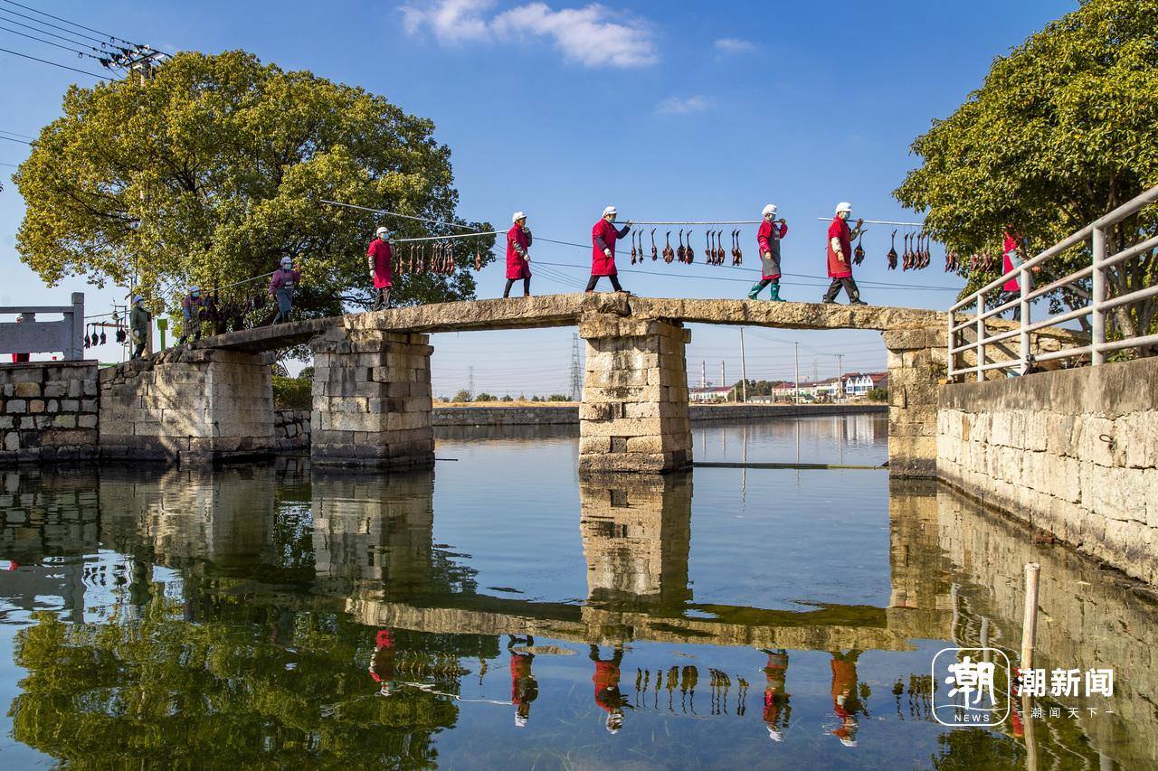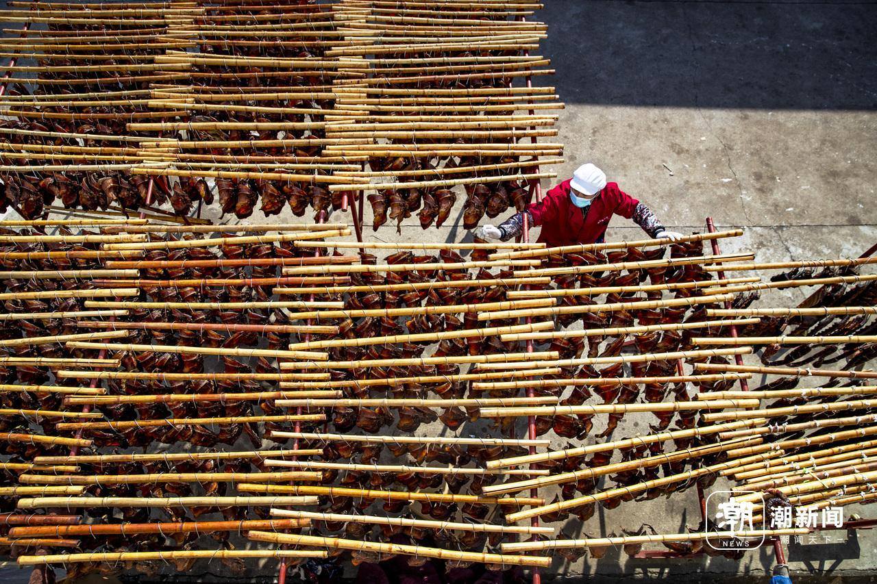 冬日的绍兴上虞区东关街道担山村,酱香弥漫。房前屋后的竹竿上,酱鸭、酱肉等酱货整齐晾晒。