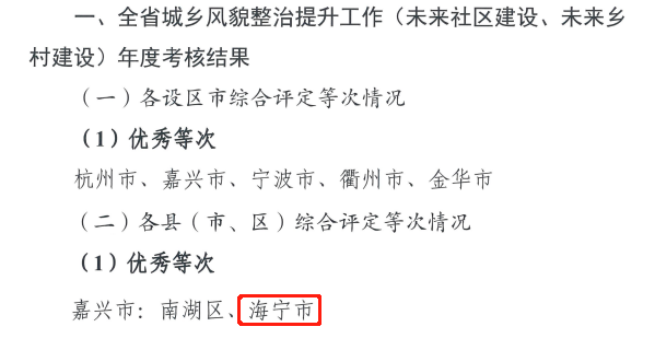 2022年,海宁市2个城乡风貌样板区、1个未来社区、3个未来乡村上榜省级名单,3个美丽城镇获评省级样板。