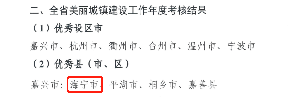 浙江在线1月13日讯(通讯员 赵美娜)海宁坚持聚焦民生实事、补齐短板弱项,以全域美丽、整体大美为目标,全域推进共同富裕现代化基本单元建设,高水平打造美丽海宁。2022年,海宁市获评全省城乡风貌整治提升工作(未来社区建设、未来乡村建设)综合评定优秀县市、全省美丽城镇建设工作年度考核优秀县市,这已是海宁连续两年考核荣获双优秀。