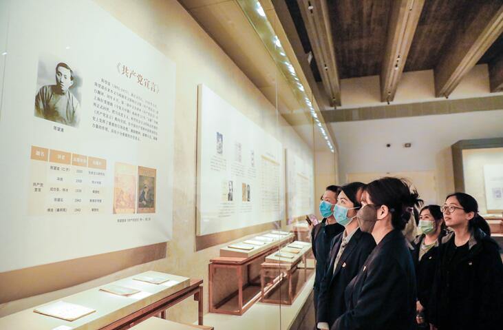 活动中,大家驻足参观了《共产党宣言》、越王州句剑等重要文物,还与“百家姓”墙面互动。在“一生的版本”展览窗前,大家寻找起记忆中的版本痕迹,深刻理解了我们每个人都是曾经版本的生产者,也是未来版本的创造者。