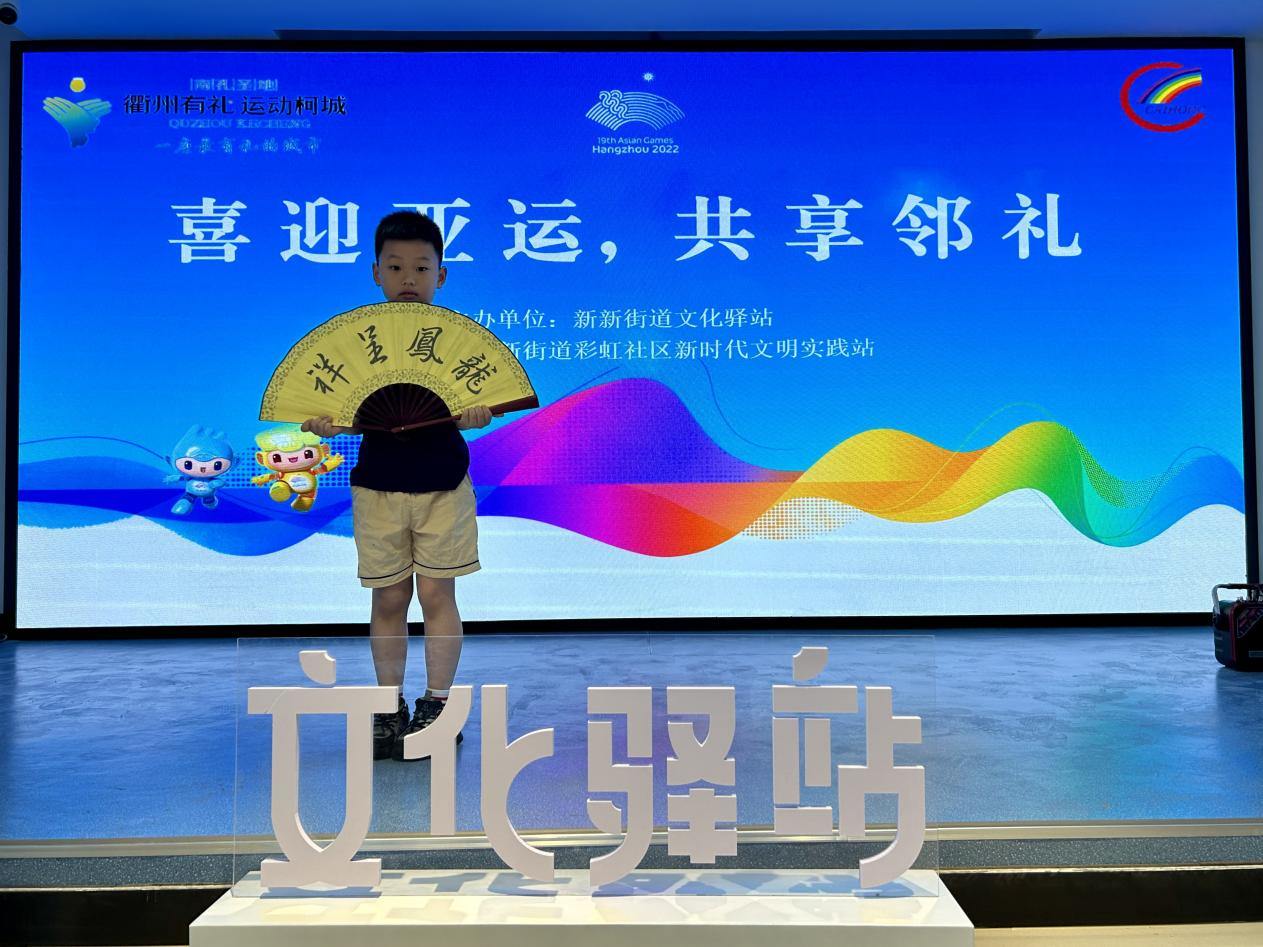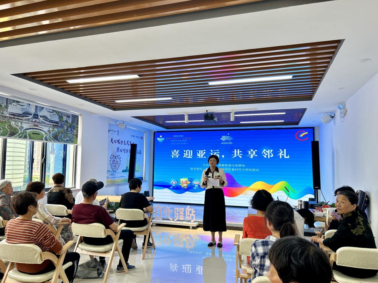 浙江在线5月19日讯(通讯员 陈欣妍)“第二题,大家知道本次杭州亚运会主题口号是什么吗?”5月17日下午,“喜迎亚运,共享邻礼”活动在衢州市柯城区新新街道文化驿站举办。众多的文艺爱好者齐聚一堂,歌唱怀旧老歌、举办亚运知识竞赛、评弹艺术欣赏……为居民朋友们送上了一场精彩的文化盛宴。