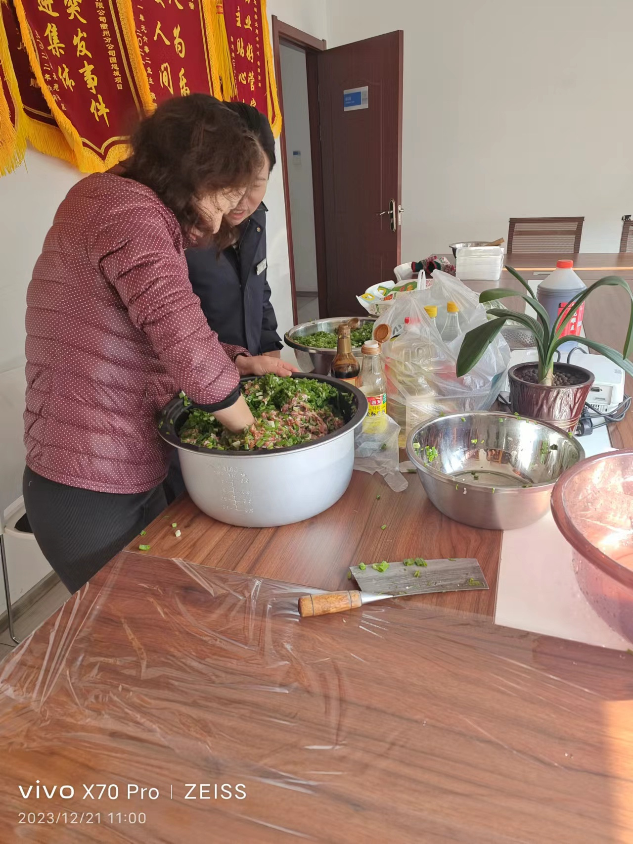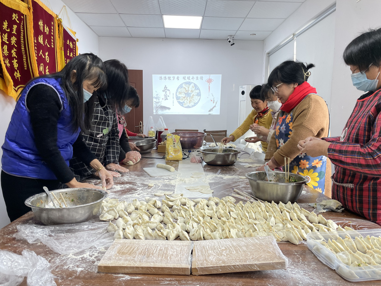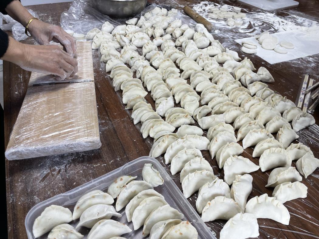 为了能让大家早点吃上新鲜热乎的饺子,社区志愿者一大早就从超市采购了新鲜食材,志愿者们更是早早来到活动室有条不紊的开始准备。现场大家分工合作,有的和面,有的擀皮,有的包馅,个个动作娴熟,相互展示分享各自的饺子形状,不一会儿,饺子就摆满了盘子。