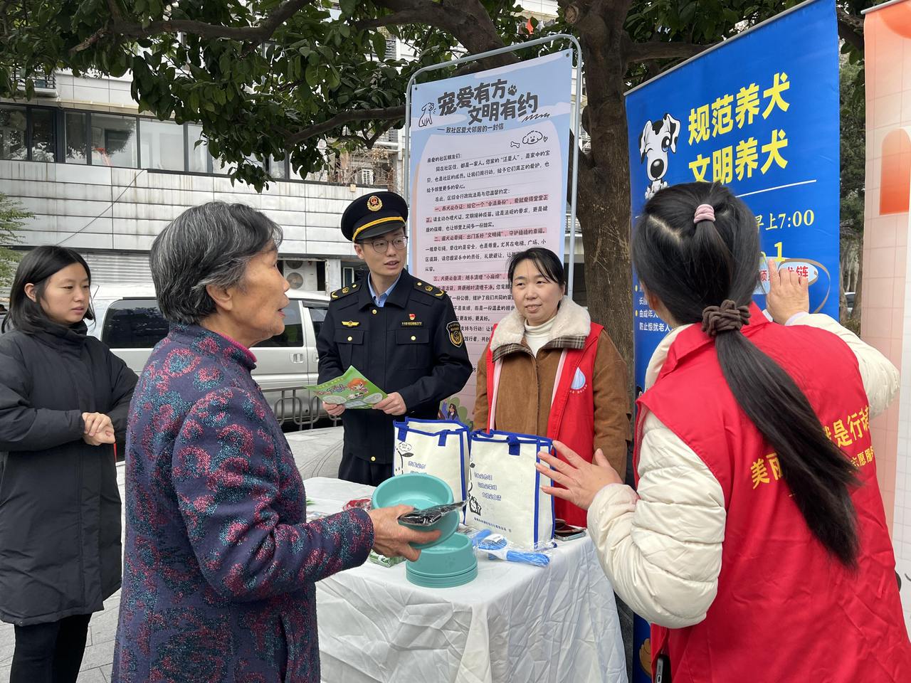 灵隐街道执法队的执法队员更现场化身“普法讲师”,为居民详细解读《杭州市限制养犬规定》相关要求,并耐心解答犬证办理、疫苗接种等常见问题。志愿者们同步发放文明养犬宣传手册,积极引导居民树立依法、文明、科学的养犬观念。