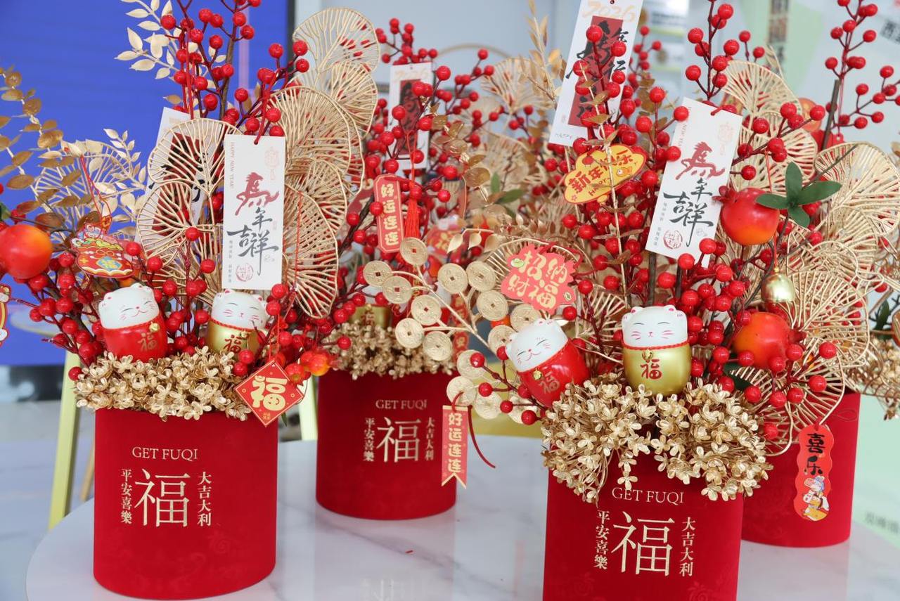 活动伊始,花艺老师为大家详细讲解了年宵花的搭配技巧、色彩美学和制作要点。随后,企业代表们纷纷化身“花艺师”,手持花枝精心构思、巧手搭配。修剪枝叶、固定花材、点缀装饰,大家一边交流创作心得,一边分享新年期许,现场欢声笑语不断。原本普通的花材,在大家的巧手下变成了一个个错落有致、寓意吉祥的年宵花桶,红彤彤的冬青象征着鸿运当头,圆润的柿子寓意着事事如意,精致的福桶承载着满满福气。
