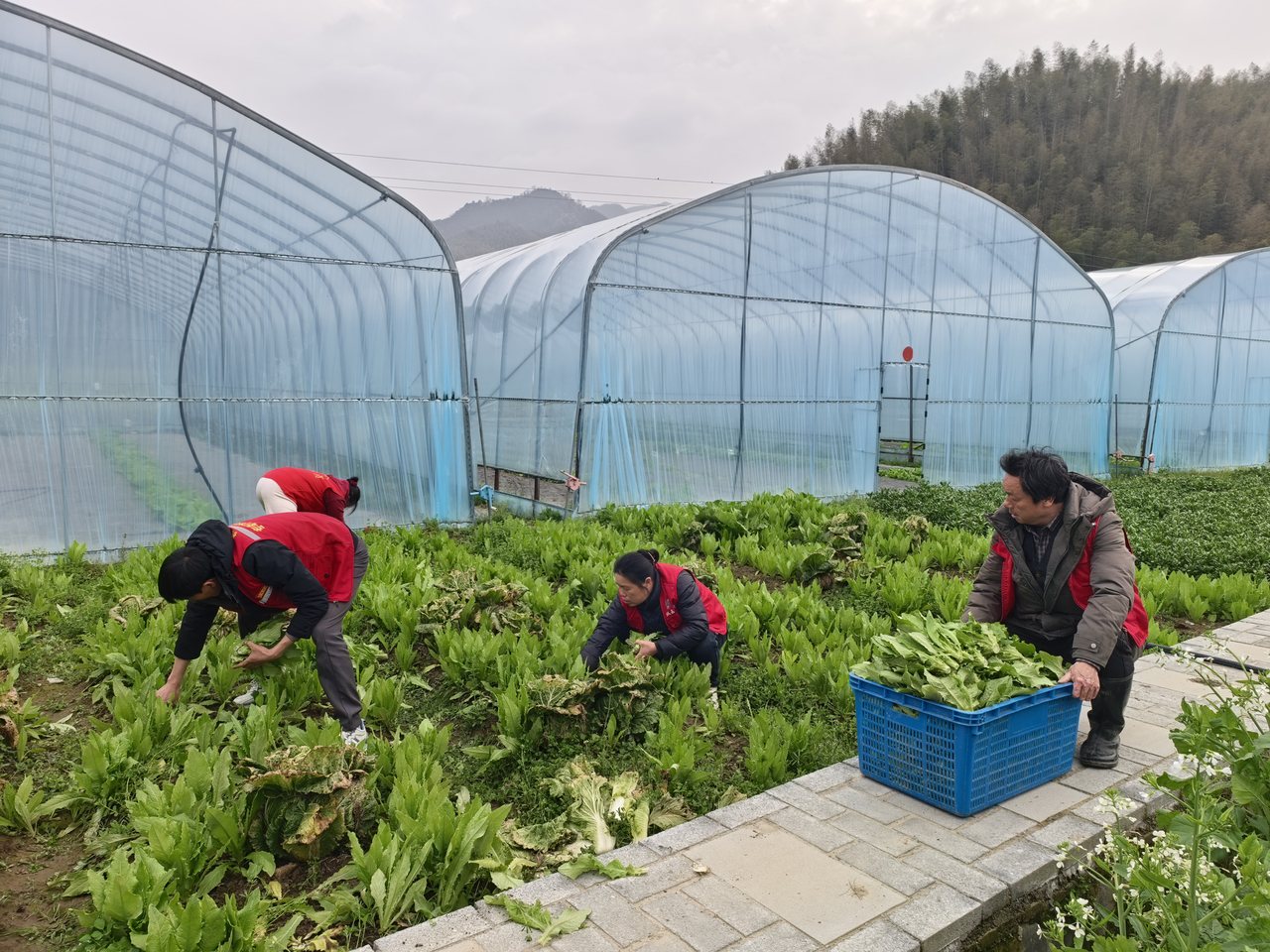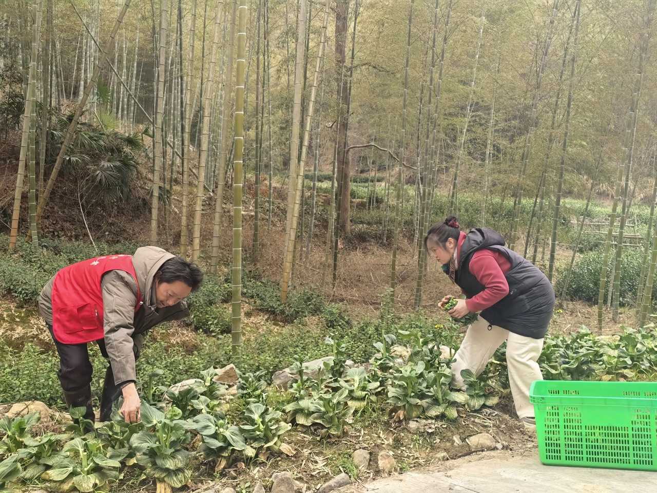 天色渐暗,淳安县石林镇双西村的菜地里仍是一片繁忙的景象。村民陆大姐弯着腰,精心挑选鲜嫩的菜心,小心翼翼地掐取苗头,整齐码进脚边的菜筐。