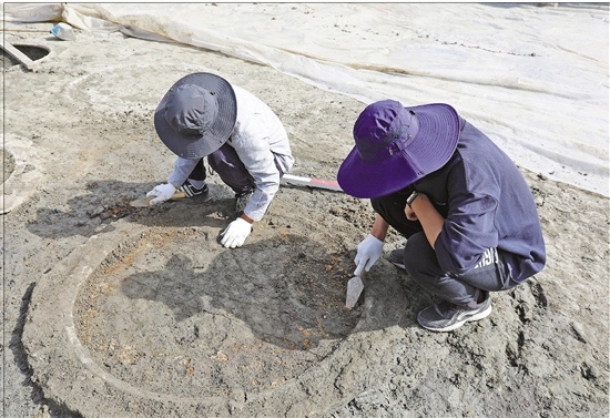 跟着周珂帆走进东塔寺遗址考古工地,记者好似走进了一个“石头阵”:有一圈圈的石头,也有横成行、纵成列的石头。周珂帆解释:“石头是我们用来做标识的,每个圆圈下对应一口缸,每条线下则埋藏着木结构的遗迹。”