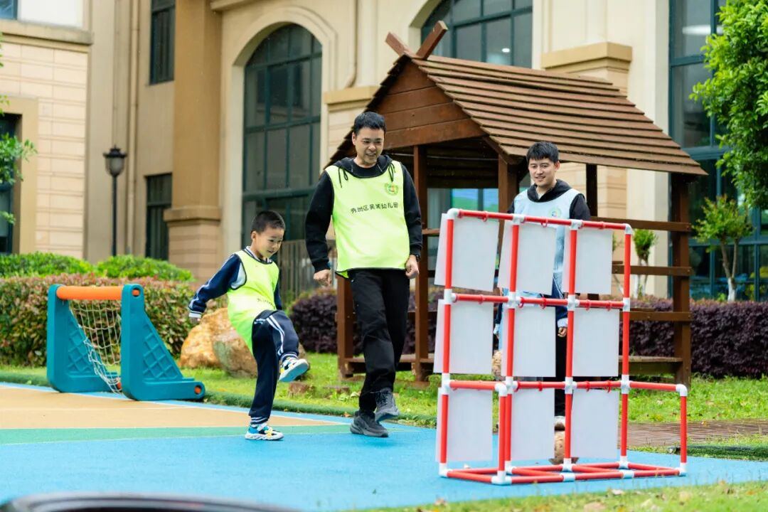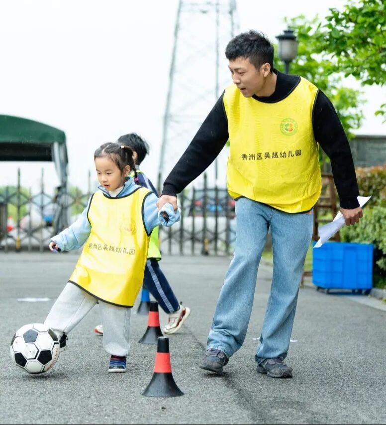 下午为亲子定向游戏实践环节,以“趣玩定向”“足球运动”为核心,57组爸爸与幼儿携手参与,现场氛围热烈。