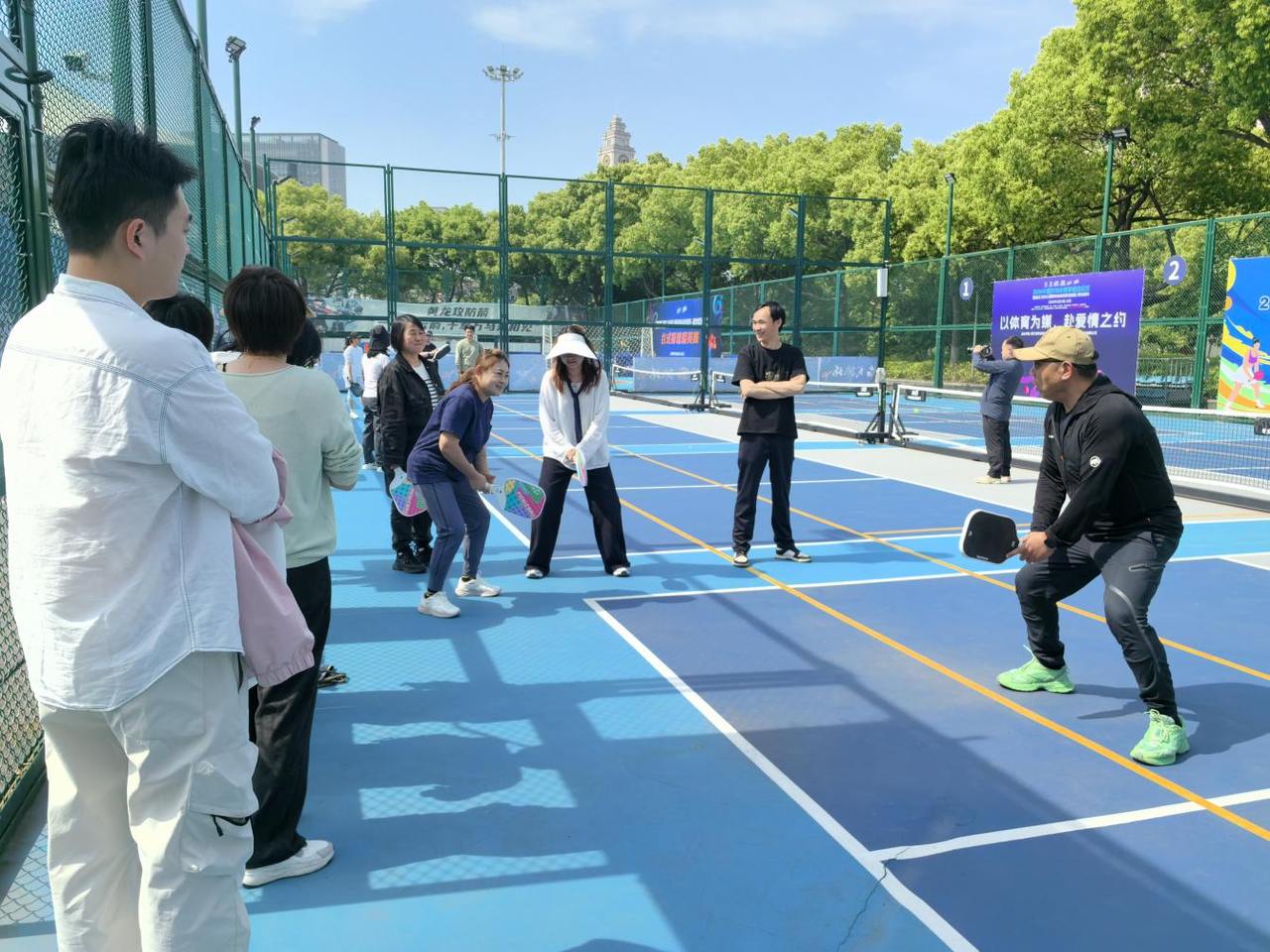 现场设置了专业教练实操带教、规则讲解与友好交流赛环节,从握拍、发球的基础动作,到攻防配合的实战技巧,零基础的参与者也能快速上手,在挥拍奔跑中感受运动的快乐。大家以球会友、以读润心,在切磋交流中传递“身体与灵魂总在路上”的生活理念,现场氛围热烈又轻松,充分展现了灵隐辖区群众昂扬向上的精神风貌。