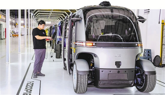 11月11日,一款无人驾驶小巴在长三角(湖州)产业合作区正式下线。图为技术人员在对即将下线的无人驾驶小巴进行最后的检测。