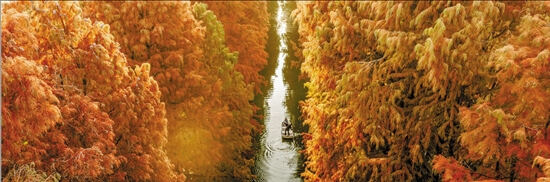 12月9日,杭州余杭良渚港南村,村子旁小河两侧整齐地排列着焦糖色的杉树,人们在夕阳的陪伴下泛舟其间。