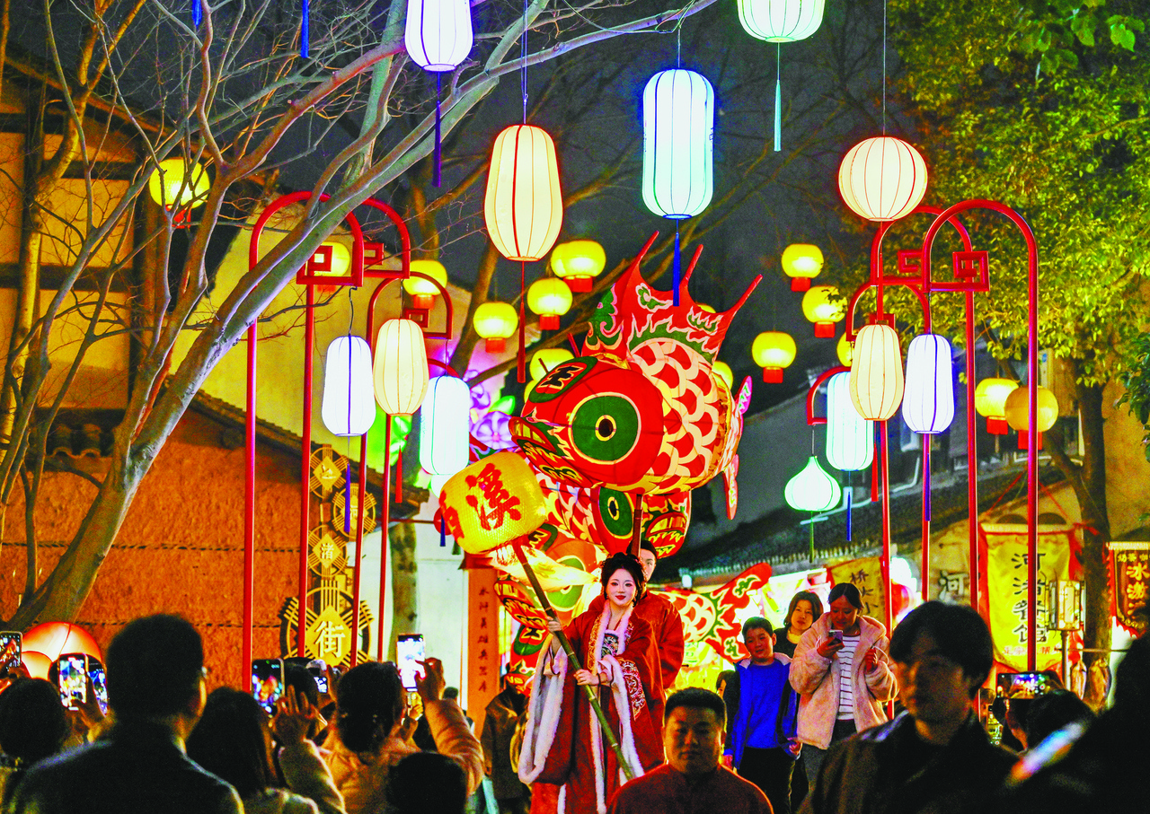 2月11日晚,杭州西溪湿地,非遗鳌鱼龙巡游吸引众多游客驻足欣赏。