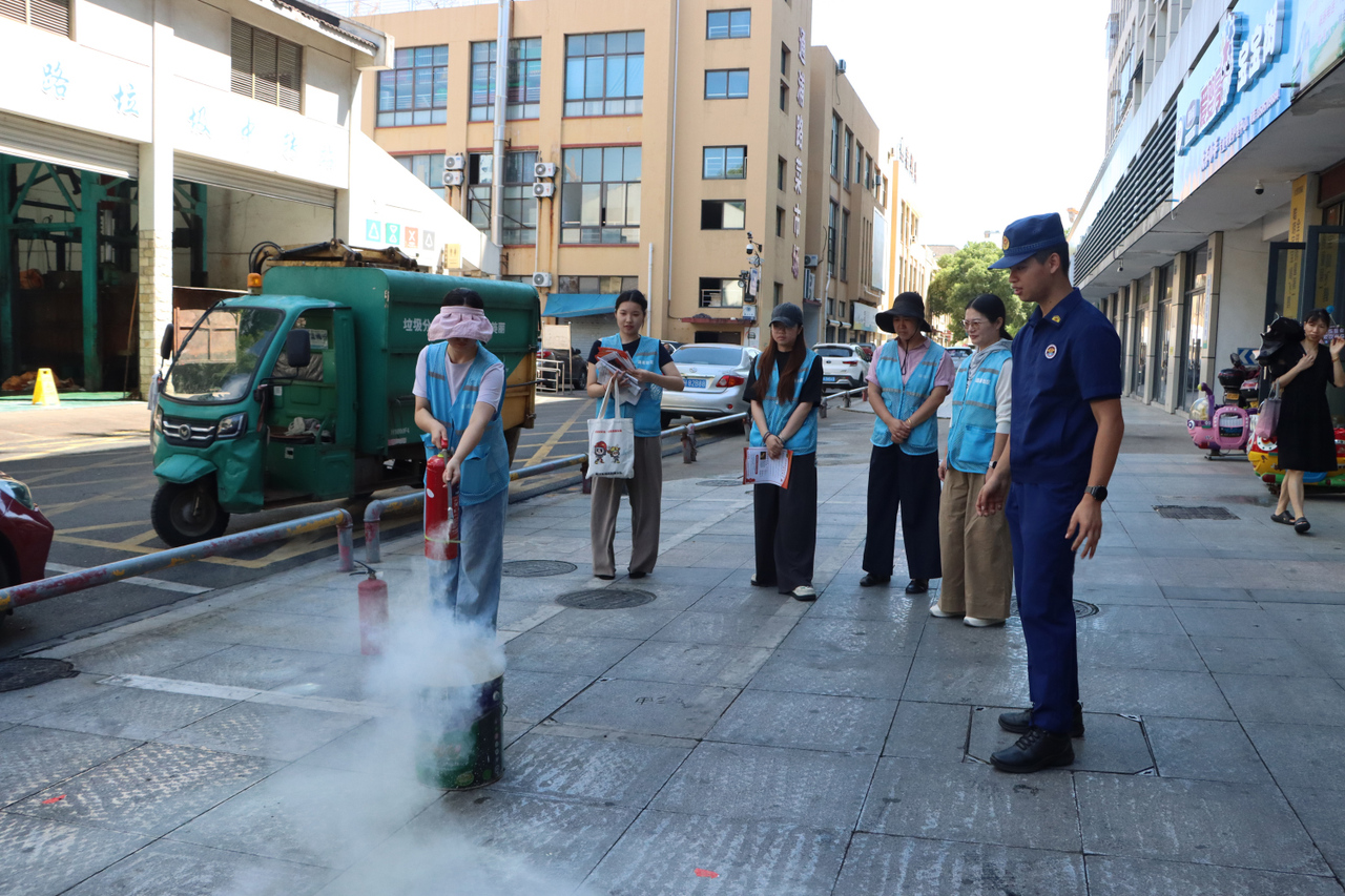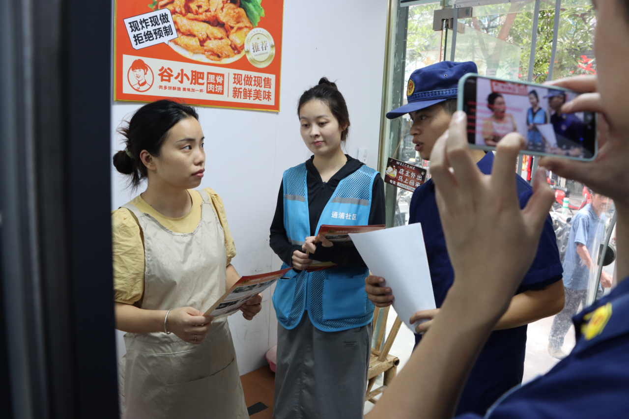 直播中,消防救援人员以“实景课堂”形式,带领线上线下观众直击曾发生火灾警情的商铺现场。通过镜头聚焦火灾痕迹,救援人员详细复盘了起火源头、火势蔓延路径、现场处置要点,并结合该起案例深入剖析防火分隔设施在阻断火势、争取救援时间中的关键作用。随后,消防救援人员与社区工作人员组成联合宣讲队,逐户向沿街商铺发放消防知识手册、533工作法宣传单页等,并针对沿街商铺常见的“三合一”住人、电气线路乱拉乱接、消防通道堵塞等隐患问题,结合近期全国典型商铺火灾案例进行“点对点”警示,同时手把手指导店主查找整改店内隐患。在互动体验环节,消防救援人员现场示范灭火器使用方法,邀请社区工作人员、商铺店主及周边群众轮番上手实操,并对群众提出的问题一一耐心解答。