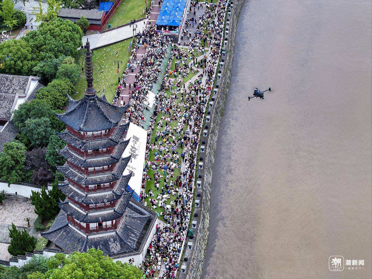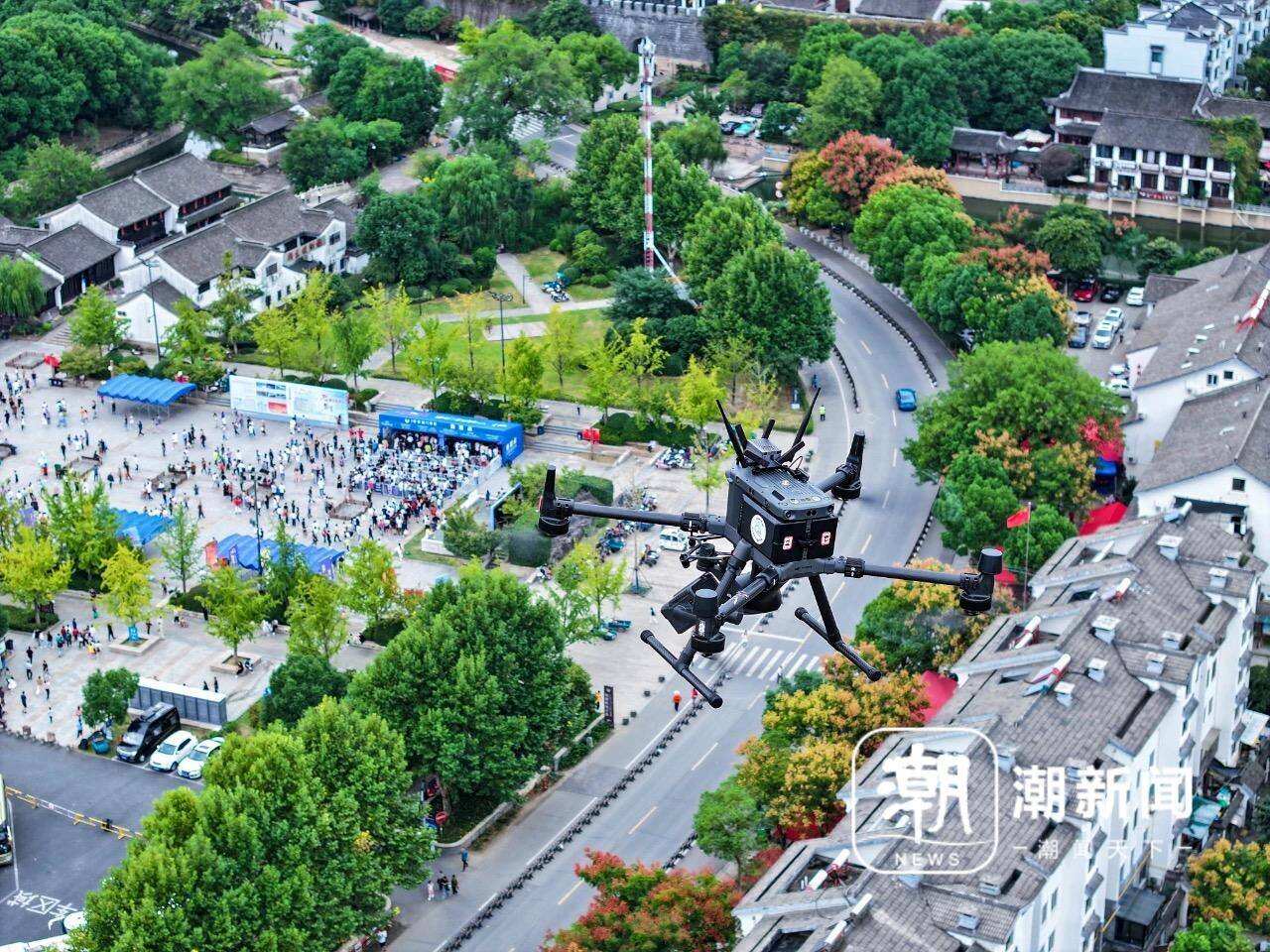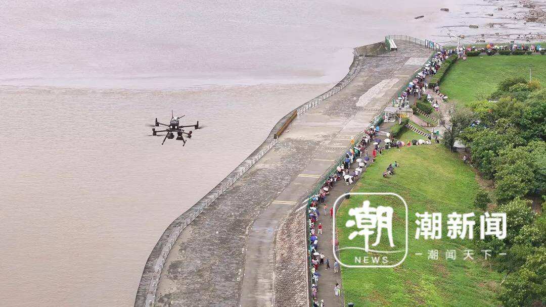 “潮水已过,请游客有序撤离,禁止下塘游玩……”10月9日14时30分,海宁市丁桥镇大缺口附近的江堤上,响起一阵清晰的警示语音。但与往日不同,这次发出提醒的并不是“喊潮人”周其明和他的队友,而是一台悬停在空中、搭载着扩音器的政务无人机。今年观潮节,无人机化身“数字喊潮人”巡航海塘、语音预警,已成为守护观潮安全的新常态。