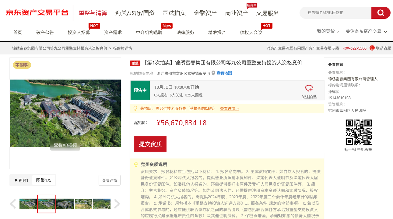 浙江在线10月13日讯 近日,锦绣富春集团有限公司管理人在京东资产交易平台发布《锦绣富春集团有限公司等九公司重整支持投资人资格招募公告》,管理人将于2025年10月30日10时至2025年10月31日10时止(延时的除外),通过网络拍卖方式公开招募重整支持投资人,以竞价方式确定取得重整支持投资人资格的主体,起拍价约5667万元,参拍保证金1133万元。