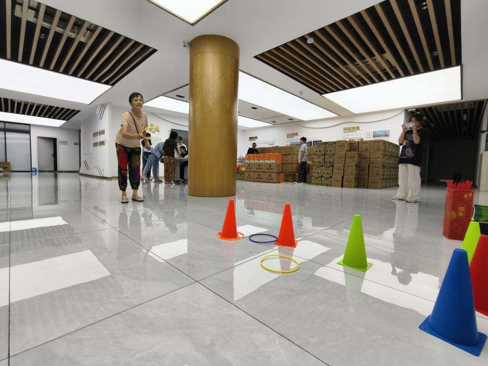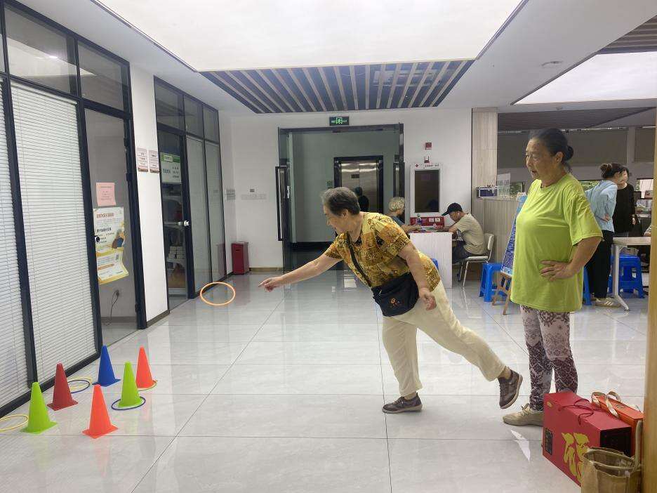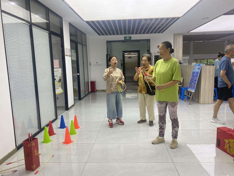 活动中,社区大厅的“趣味运动会”成了老人们的欢乐主场。套圈、投壶、高尔夫……各式各样妙趣横生的项目让社区大厅笑声不断,不少老人瞬间化身“运动健将”,尽情享受着趣味运动的快乐:套圈时,彩色圈圈在空中划出俏皮弧线,“中啦——”的欢呼声能顺着窗户飞出好远;投壶游戏里,木箭带着大伙儿的笑声“叮铃桄榔”奔向壶口,哪怕没投中,也能惹得一圈人弯腰笑个不停;一旁的迷你高尔夫游戏也很受欢迎,长辈们握着小球杆,眼睛紧紧盯着球洞,腰鼓队的的张阿姨打出一个漂亮的“进洞”,瞬间收获一片喝彩,连说“这比打腰鼓还带劲!”。