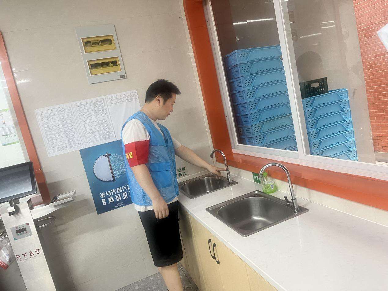 活动以“校园赋能”为起点,社区工作人员首先走进辖区江锦小学,将宣传阵地精准锚定学校食堂这一用水关键区域。针对校园用水集中、人员密集的特点,工作人员围绕“保供水、抓节水”两大核心要求,为食堂管理人员、后勤工作人员开展专项宣讲:既详细解读校园用水安全的重要性,也提供可落地的实操方案及二次利用技巧,建议建立用水设备“周巡查、月检修”制度,同时明确餐厨废水需经规范过滤后再排放,从源头减少水资源浪费和环境污染,让校园成为节水护水的“示范课堂”。