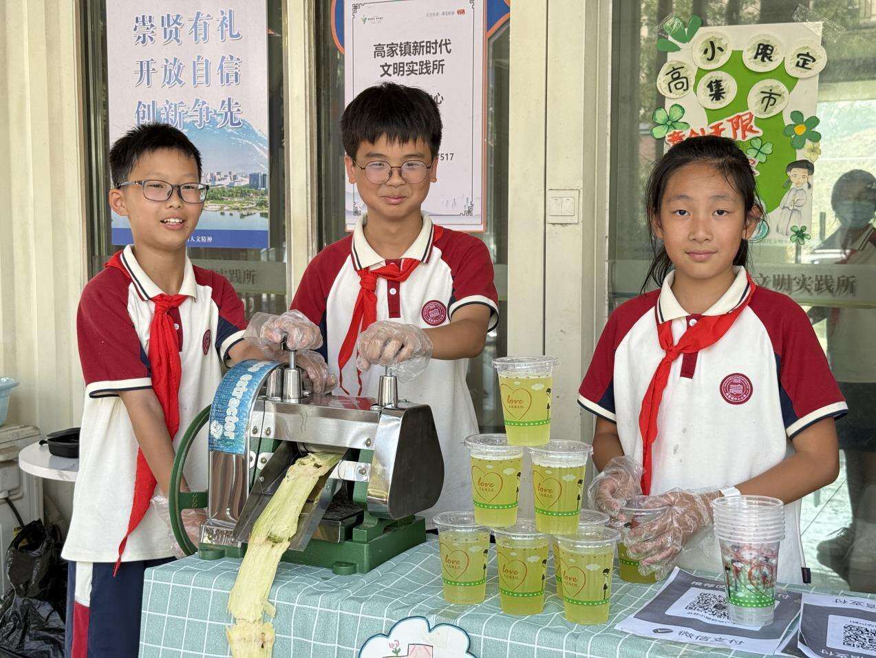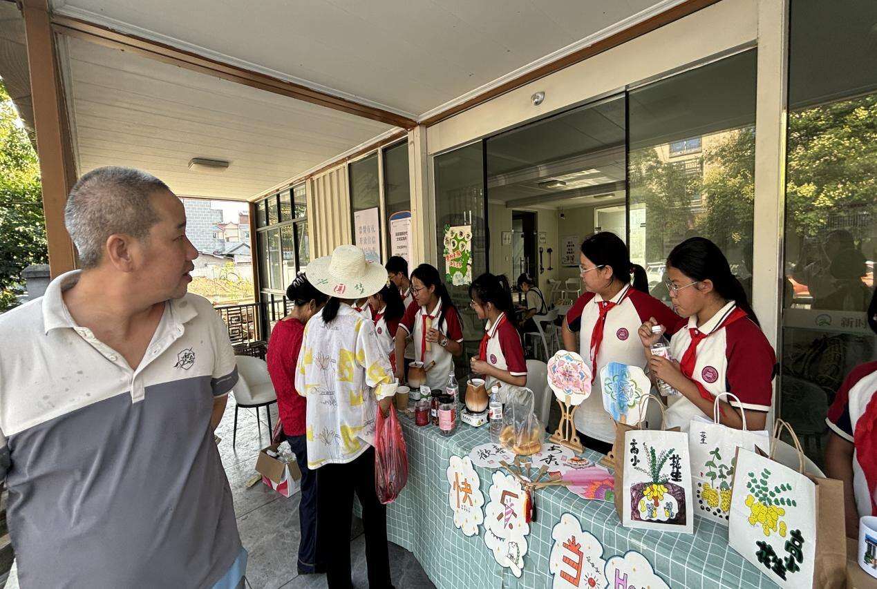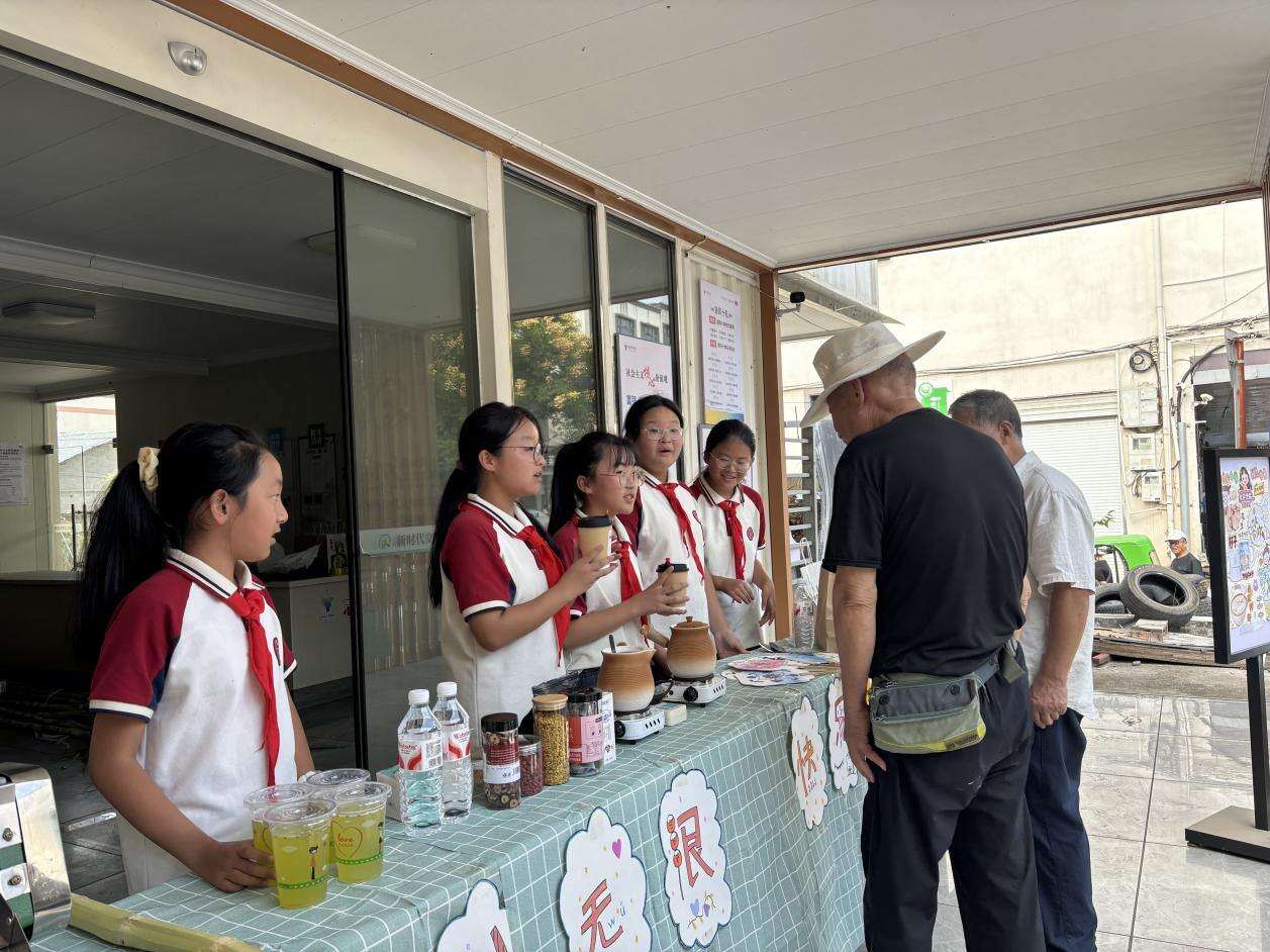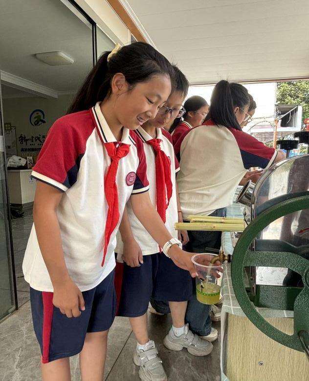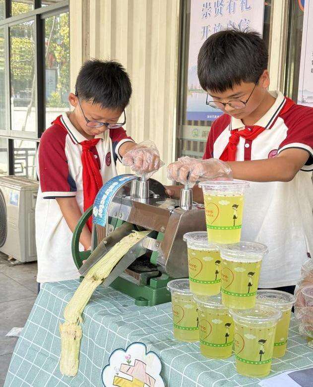 踏入集市,仿佛走进了一个充满童趣与创意的奇妙世界。瞧,孩子们化身小小“农商”,将校内外劳动实践基地里亲手种植的甘蔗,通过自己的努力榨成清甜可口的甘蔗汁,热情地向过往的顾客售卖。那专注的神情,仿佛在诉说着劳动带来的自豪与满足。一旁,校内“古盈川长”种植的黑花生也成了集市上的“明星产品”,颗颗饱满的黑花生,承载着孩子们辛勤耕耘的汗水。