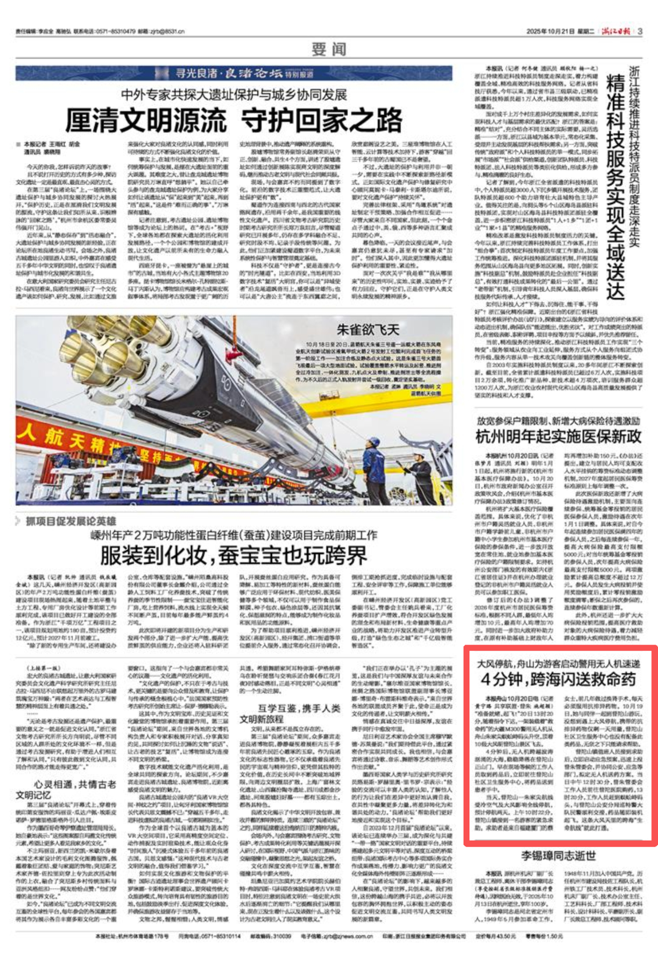 “准备就绪,起飞!”10月20日13时20分,随着指令下达,一架装载着“救命药”的大疆M300警用无人机从舟山朱家尖蜈蚣峙码头升空,顶着10级大风朝普陀山景区飞去。