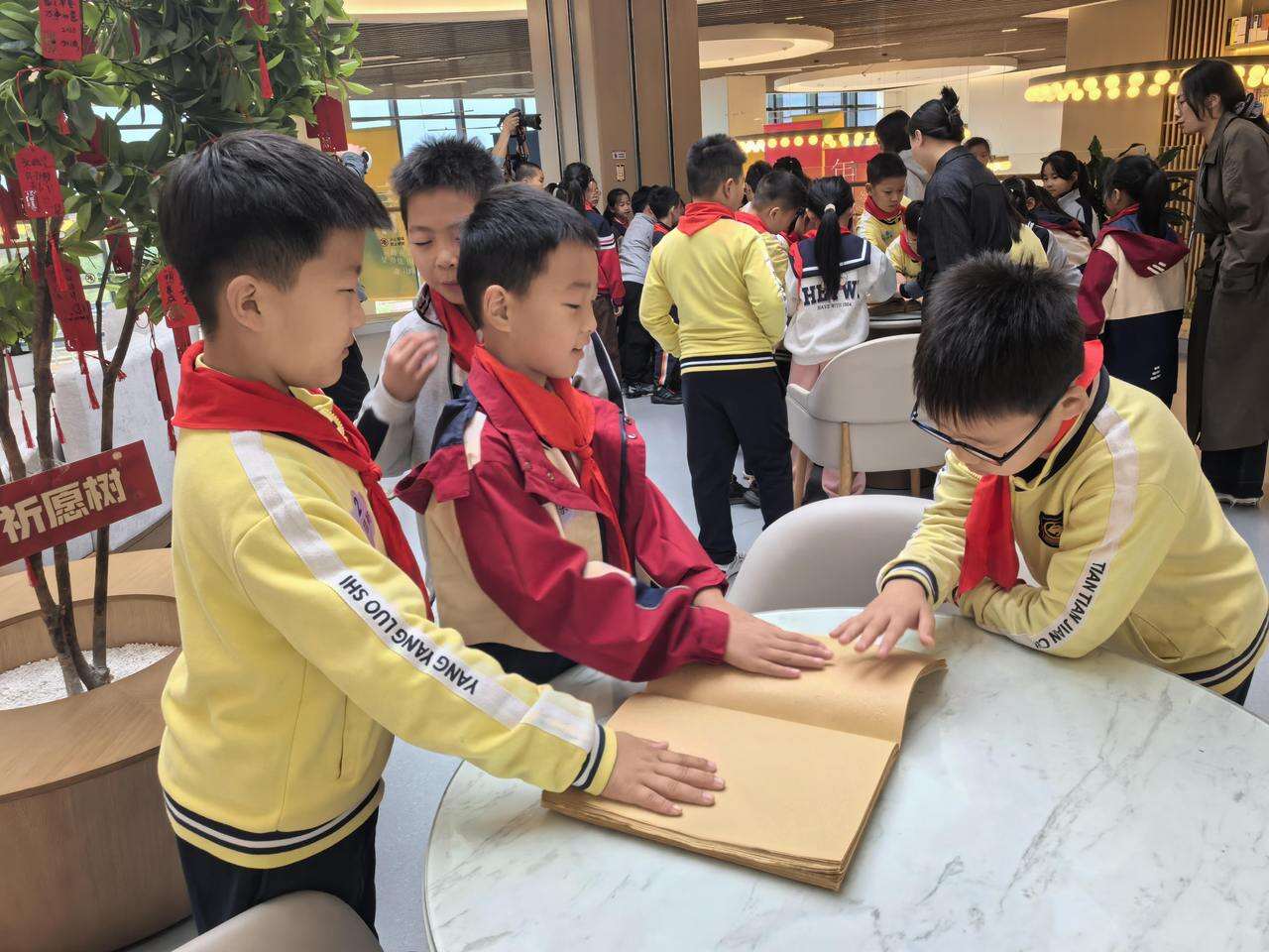 在场馆讲解老师的引领下,孩子们开启了场馆探索之旅。图书馆内,他们的目光流连于色彩斑斓的文化墙,身影穿梭在充满童趣的绘本区与高耸的书架长廊之间……孩子们在盲文阅览区驻足,用指尖轻轻触摸那些凸起的文字,完成了一场无声而深刻的对话……