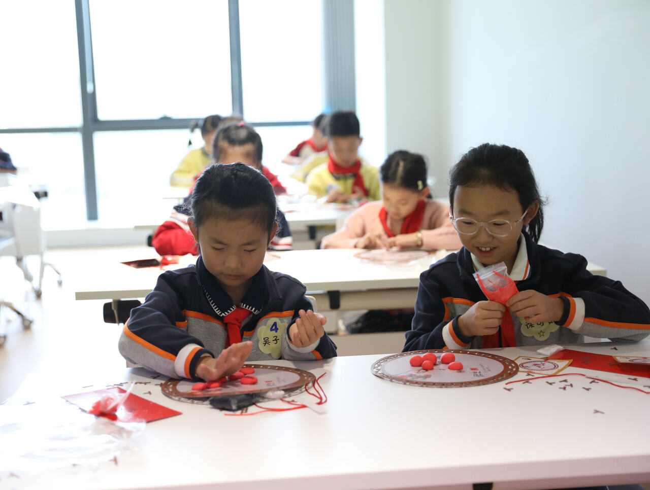 文化体验活动在活动室展开。图书馆老师以故事、图片结合互动问答的形式,深入浅出讲解霜降“进补防寒”“赏菊登高”的习俗,以及重阳“敬老爱老”“插茱萸饮菊花酒”的传统,让孩子们在趣味中了解“二十四节气”与传统节日的文化内涵。之后孩子们用彩纸、黏土等材料,制作出霜降挂饰,寓意“霜降迎寒,万物收藏”。大家还在老师的指导下,用彩纸、画笔,精心制作贺卡,写下对长辈的暖心祝福。成果展示环节中,各小组依次分享手工作品与体验心得。“我要把今天的作品送给奶奶,祝她健康快乐!”孩子们的笑容是那么灿烂。