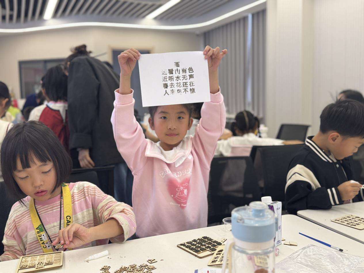 理论铺垫过后,最受期待的活字印刷小制作环节正式开启。手工指导老师手持活字模块,详细演示了“拣字—排版—上墨—拓印”的完整流程,从如何辨别汉字正反、如何将活字固定在版框中,到如何均匀蘸墨、如何轻压拓印出清晰字迹,每一个步骤都讲解得细致入微。孩子们围在桌前,眼神专注,小心翼翼地挑选活字、调整排列顺序,在老师的耐心指导下,将一首首经典古诗“组装”成印刷版。当蘸满墨汁的刷子轻轻拂过活字,当白纸覆盖、轻压后缓缓揭开,一幅幅带着墨香的诗词作品呈现在眼前时,孩子们的脸上都洋溢着自豪与喜悦,纷纷举起作品与同伴分享。