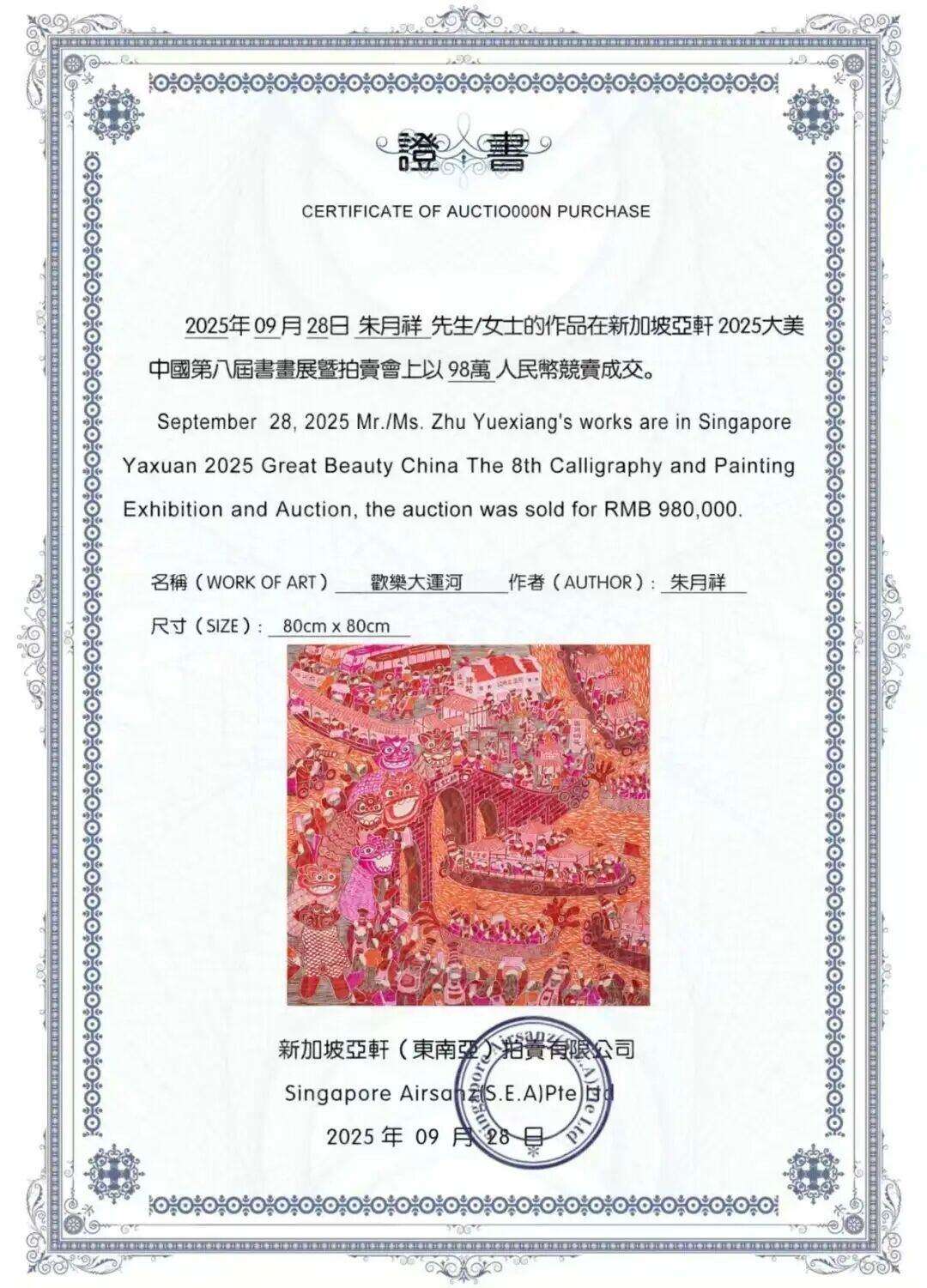 日前,由中国民间文艺家协会会员、省非物质文化遗产(秀洲农民画)代表性传承人朱月祥创作的《欢乐大运河》在新加坡亚轩2025“大美中国”第八届书画展暨拍卖会上以98万元人民币落槌,由此创造中国当代民间艺术秀洲农民画在国际拍卖市场的首次拍卖记录。
