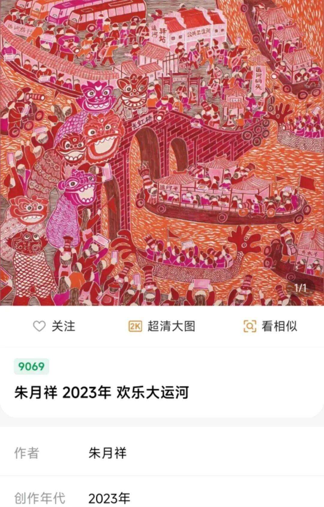 “许多工作我都亲身参与其中,我对这片土地饱含深情,大运河也给予了我丰富的创作灵感。”他感慨道,“这幅作品是我2023年创作的,从构思、构图到创作完成,用了一年多时间。我还为这幅画创作了一幅版画,版画也入选了中国现代民间绘画双年展收藏奖。”