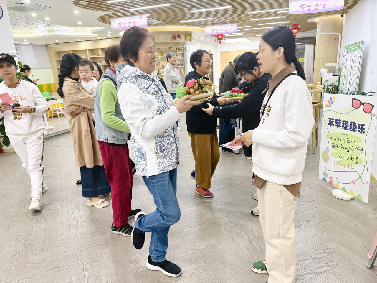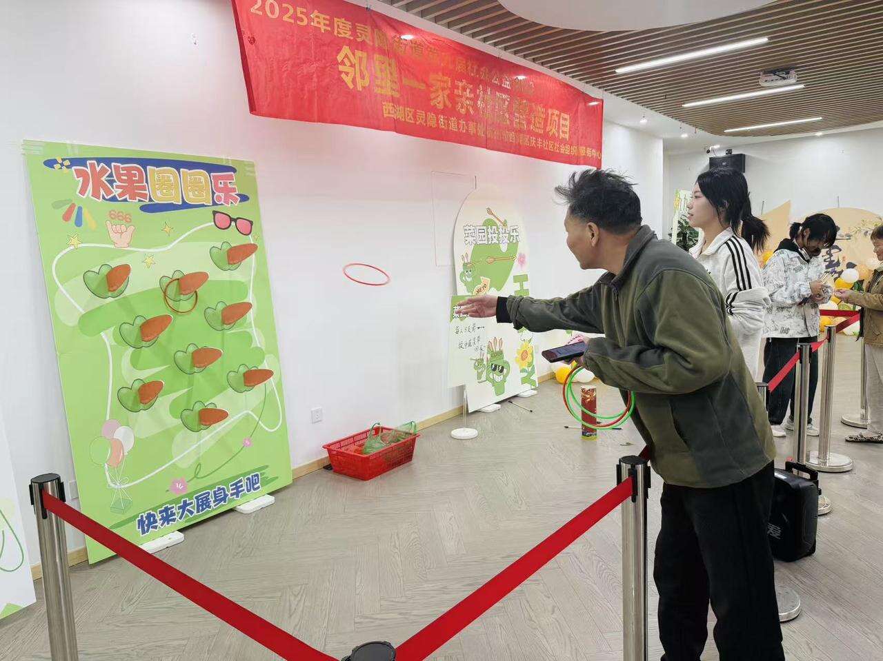 "套中了!套中了!"水果圈圈乐区域传来阵阵欢呼。老人们站在线外,将彩色圆环投向背景板上的胡萝卜,投中了即可获得玉米、黄瓜、苹果等新鲜水果。隔壁的菜园投壶区则充满古风韵味,竹制箭矢投入陶壶的"咚咚"声此起彼伏。社区工作人员特意将投壶距离缩短至1米,让每位参与者都能体验"百发百中"的快乐。