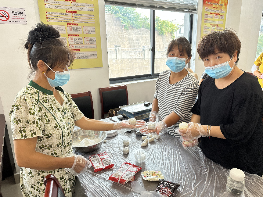 本次活动,以制作手工月饼为主题,制作完成的月饼再由志愿者们统一送到姜家敬老院,为即将到来的重阳节献礼。活动当天,桌子上摆满了制作月饼的面粉、馅料,还有包装用的塑料膜、纸盒等材料。社区工作人员与妇女志愿者们围坐在一起,揉面团、包馅料、压模具……大家手法娴熟,欢声笑语不断。