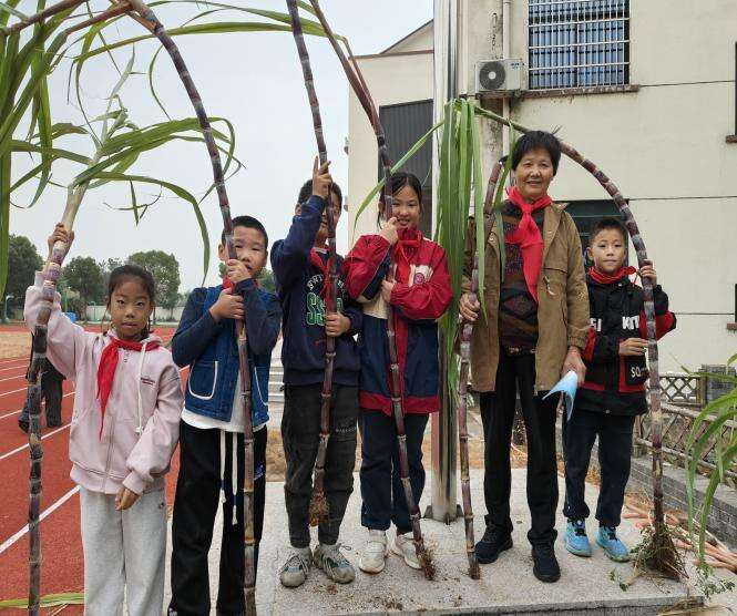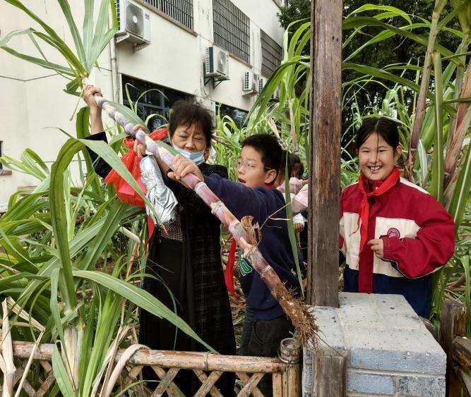 活动尾声,退休教师们与孩子们一同走进学校甘蔗种植基地,亲手收割甘蔗,现场体验榨取甘蔗汁的甜蜜与乐趣,欢声笑语回荡在田间地头。