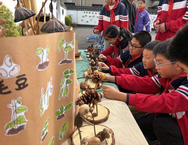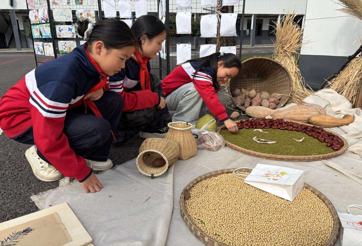 活动设三大特色展区,将“五感体验”贯穿始终。“丰收祈盼”民俗区里,金黄玉米、火红辣椒等作物铺展成“大地调色盘”,学生听晒秋故事、闻谷物清香、触果实质感,还品尝红薯干、炒黄豆等秋日美味,亲身解码千年晒秋民俗的文化内核。