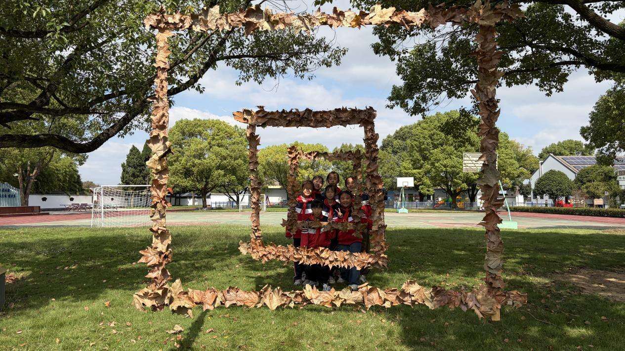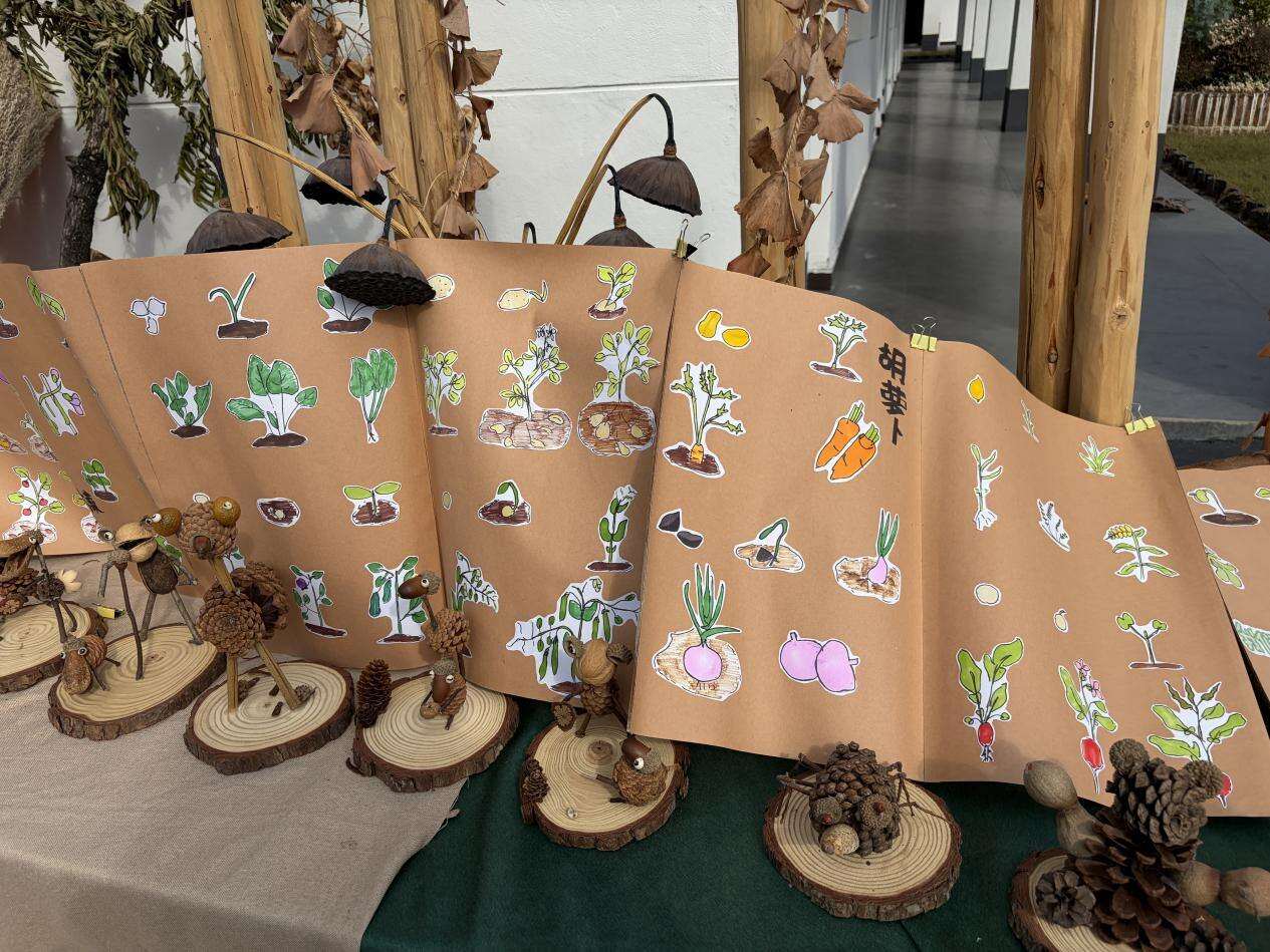 “硕果飘香”学业区,优秀作业本、书法作品、读书笔记整齐陈列,学生互阅交流、交换阅读感悟,让知识收获与秋日丰收共振。“秋意童趣”美育区则成了创意天地,泥染、树叶风车、果实风铃等自然手作琳琅满目,六年级学生全程参与展陈设计,用艺术语言诉说心中的秋天。