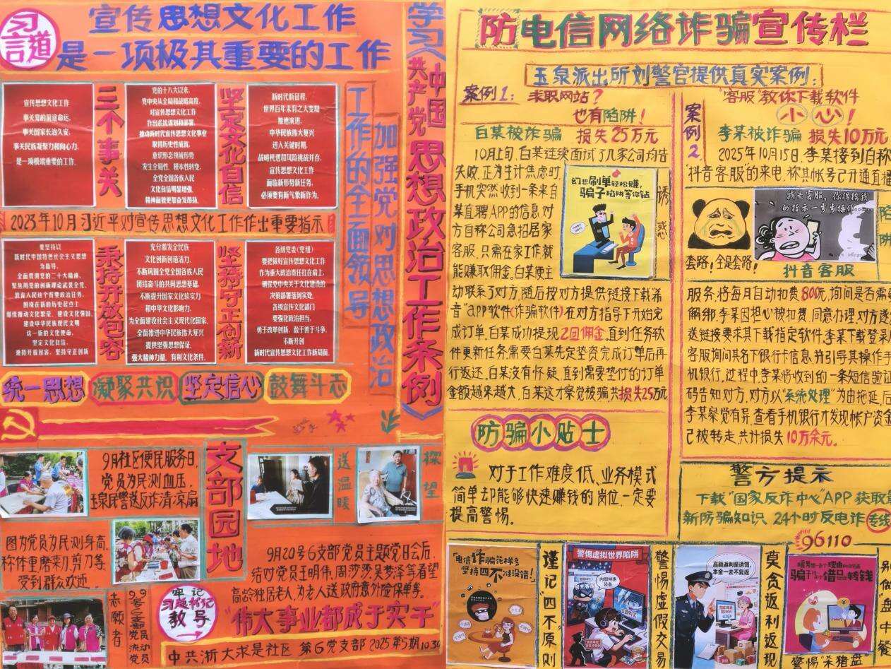 这一期宣传栏内容丰富多元,涵盖思想文化、反诈、垃圾分类、健康知识四大板块。从“三个事关”“两个巩固”等维度,阐述了加强党对思想政治工作的全面领导的深刻内涵,用支部党员为居民测血压、走访慰问高龄老人等“支部园地”的鲜活画面,将理论与实践结合,让居民真切感受到思想文化工作就是身边的关怀。