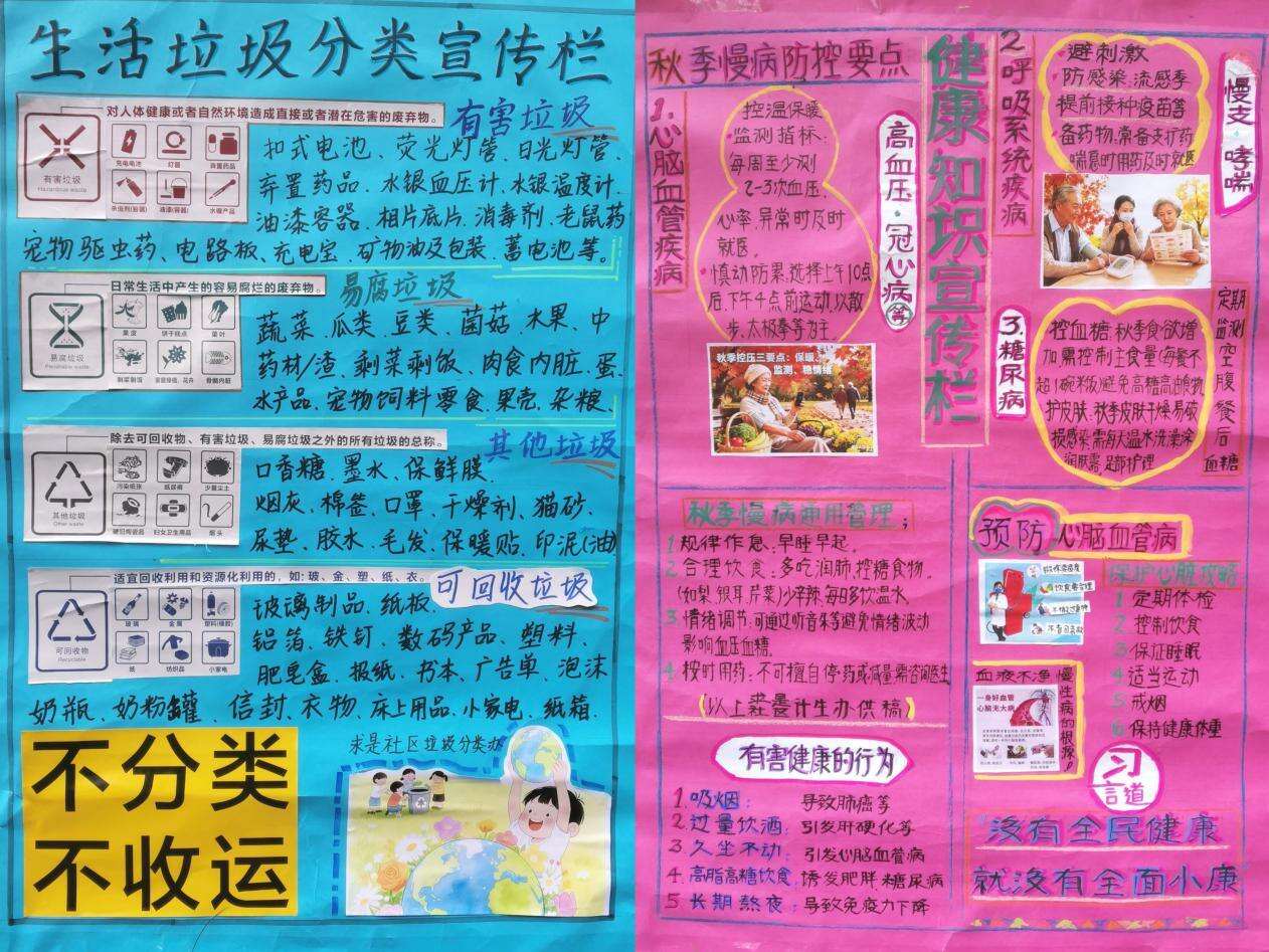 垃圾分类板块则将专业知识变得“看得见、记得住”,将垃圾分类标准以清晰的图示和文字呈现,专业的编绘让枯燥的分类知识变得生动易懂,助力社区垃圾分类工作的深入推进。健康知识板块则聚焦秋季慢病防控,针对常见慢性病,从控温保暖、合理饮食、规律作息等方面给出了具体的防控要点,提醒居民关注自身健康,践行健康生活方式。