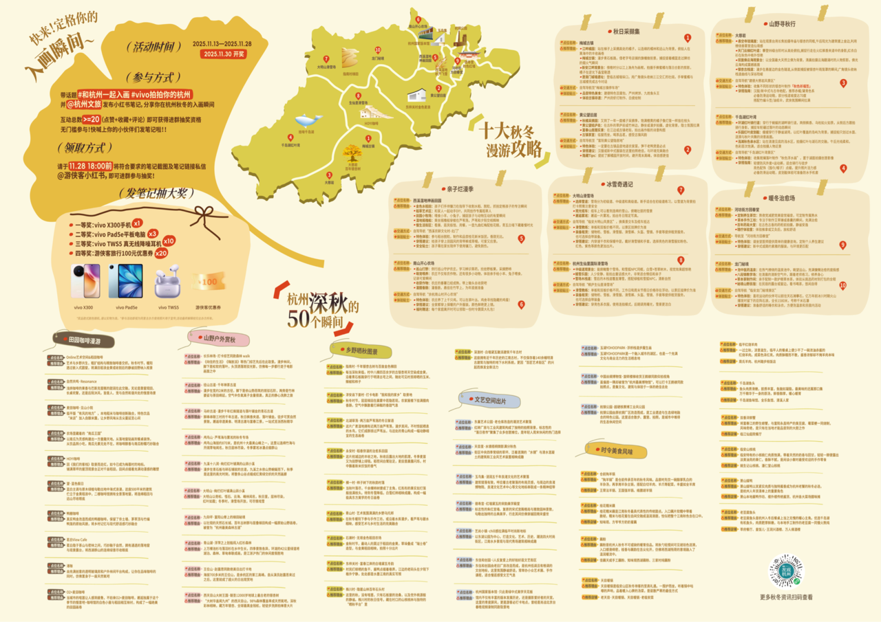 11月13日至11月28日,在小红书分享在杭州秋冬的入画瞬间,带上话题#和杭州一起入画 #vivo拍拍你的杭州并@杭州文旅,互动总数>=20(点赞+收藏+评论),在11月28日18:00前将符合要求的笔记截图及笔记链接私信@游侠客小红书,即可获得进群抽奖资格。参与活动将有机会获得vivoX300手机、vivo Pad5e平板电脑、vivo TWS5真无线降噪耳机、游侠客旅行100元优惠券等多重好礼。
