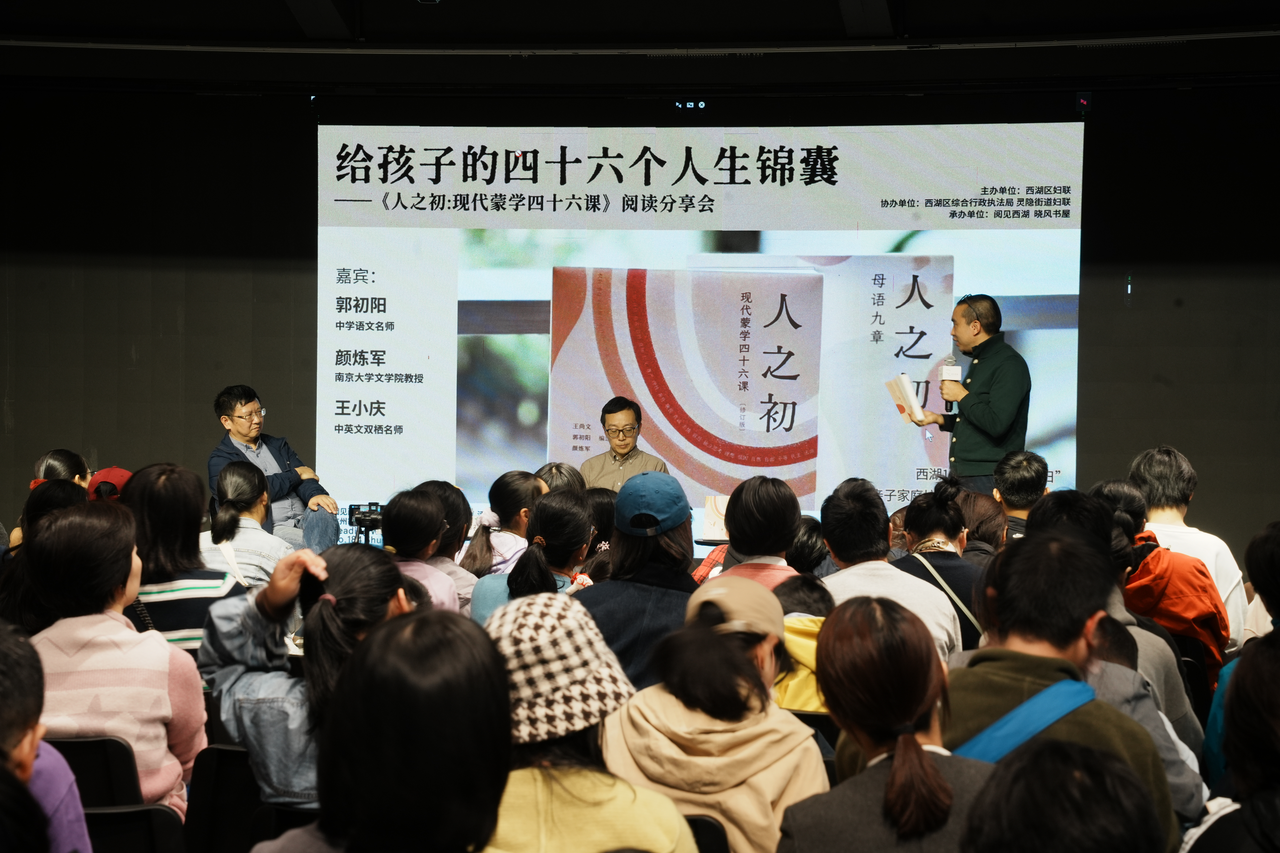 活动的重头戏,是一场名为“给孩子的四十六个人生锦囊”的阅读分享会。语文名师郭初阳、南京大学文学院教授颜炼军、中英文双栖名师王小庆借《人之初:现代蒙学四十六课》一文,与百余位亲子家庭展开了一场关于成长与教育的温暖对话。