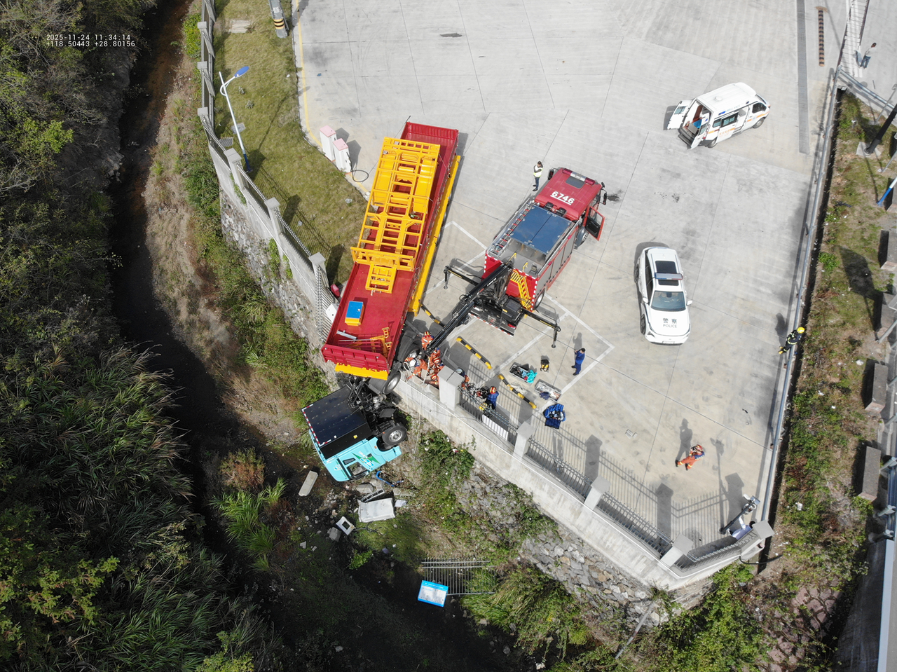 消防救援人员到达现场后发现,事故为一辆电动重型挂车车头冲出道路护栏,整个驾驶室悬空,挂在距路面约十米高的河沿上,摇摇欲坠,情况万分危急。驾驶员因撞击腿部受伤,被困驾驶室内,无法自行脱身。