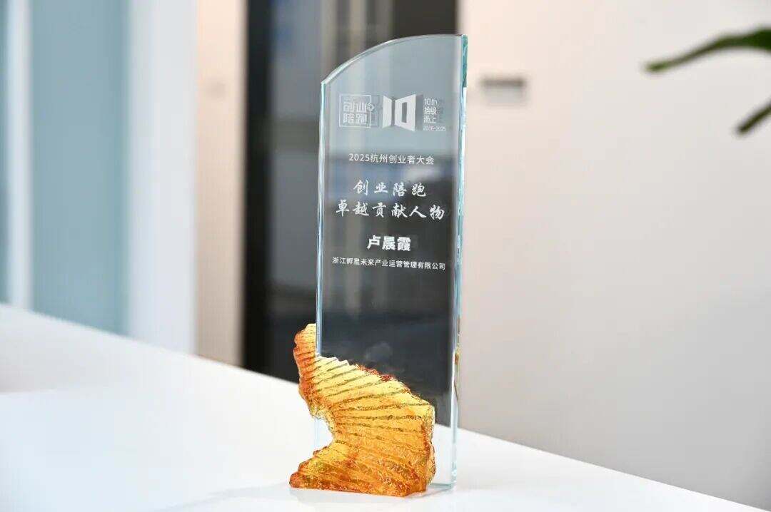 在大会重要环节中,浙江孵星未来产业运营管理有限公司总经理卢晨霞荣获“创业陪跑卓越贡献人物”称号,以表彰她在创业孵化、科技成果转化及创新创业生态构建方面的突出贡献。
