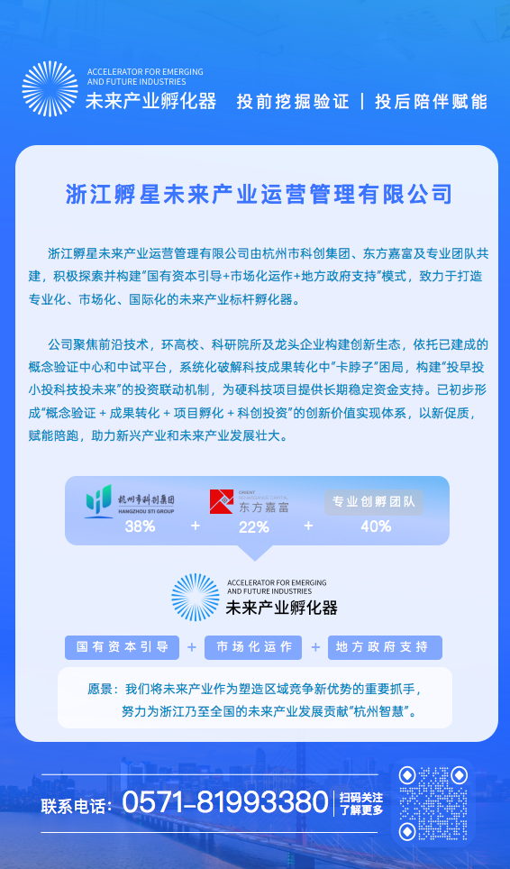 浙江孵星由杭州市科创集团、东方嘉富及专业团队共建,积极探索并构建“国有资本引导+市场化运作+地方政府支持”模式,致力于打造专业化、市场化、国际化的未来产业标杆孵化器。