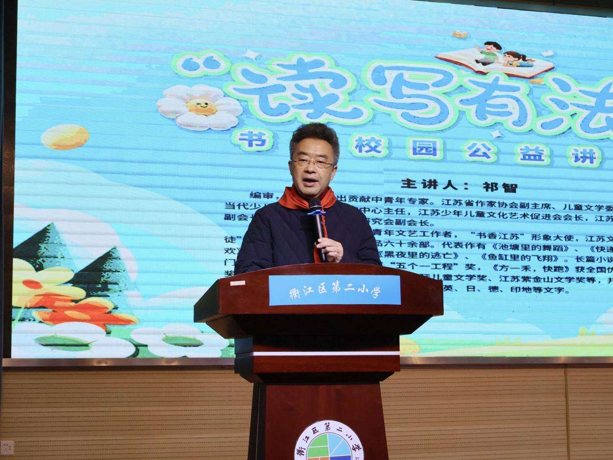 浙江在线11月28日讯(通讯员 赵孟颖)冬阳暖照,书香致远。11月27日,衢州市衢江区第二小学洋溢着浓郁的书香气息,“点亮阅读之灯”阅读共同体活动暨阅读启航活动在学校报告厅隆重举行。活动邀请了著名儿童文学作家祁智老师进校园开展公益讲座,为师生搭建与名家面对面交流的平台,正式开启校园全民阅读的新篇章。区教育局汪轶群、苏鲁成两位老师和六年级三百多位师生一起参加了活动。