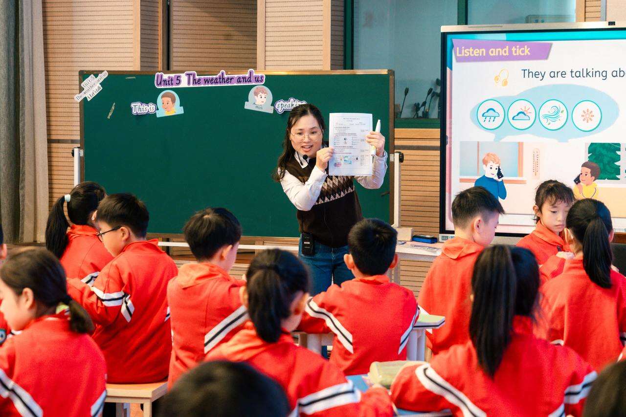 衢江区实验小学教研组长郑玉蕊与四(3)班同学共同呈现了一节精彩的英语对话课。本节课围绕John和Mark打电话谈论“the weather in Beijing and Sydney”的对话展开。郑老师通过听音选择、观看回答、听音配对等层层递进的学习任务,引导学生在理解语篇内容的同时,深入了解“different places,different weather”的主题意义,以回应本单元A部分的问题。介绍世界其他城市的天气时,引出John的爸爸要出行的情境,体现单元整体教学。迁移创新活动通过AI赋能查询本地和其他城市实时天气,贴近学生实际,有效地实现了“让核心素养落地”的目标。