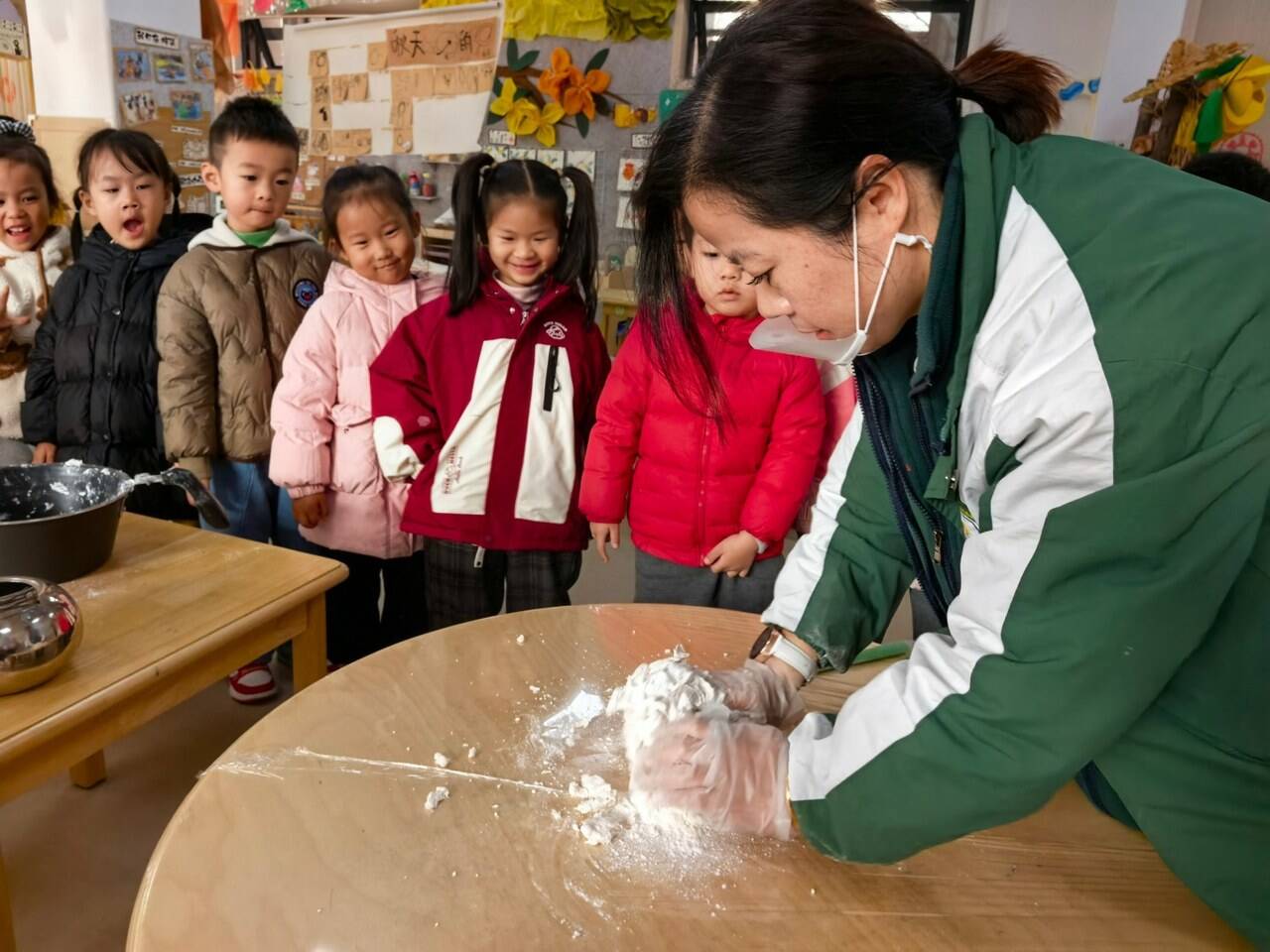 教室里的氛围越来越热闹。有的孩子把面团搓成了“小元宝”,说要送给奶奶当作“新年礼物”;有的把三个小汤圆叠在一起,说是“雪人汤圆”;还有的偷偷在面团里裹了一颗葡萄干,捂着碗跟同桌小声炫耀:“我的汤圆里有‘小惊喜’!”胡老师看着孩子们沾满面粉的小手和亮晶晶的眼睛,笑着拿出手机记录下这美好的一幕,说:“你们看,每个汤圆都不一样,就像咱们班的小朋友,各有各的可爱!”