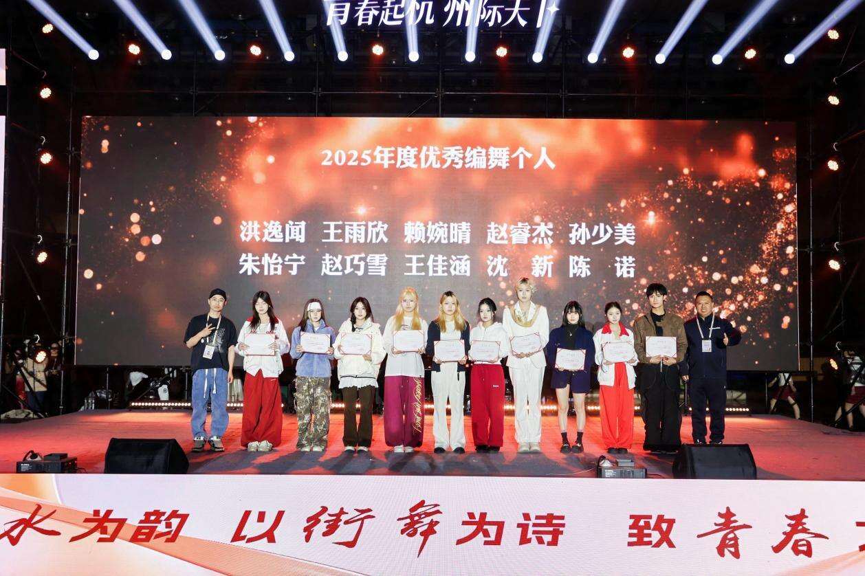 颁奖环节星光熠熠,2025年度十佳优秀团队、十佳街舞作品、十佳新锐舞者奖等九项大奖逐一揭晓。其中,杭州市青年街舞队的高雄凭借过硬的专业实力与行业贡献,摘得首届“星浪奖”,这一荣誉不仅是对其个人的高度认可,更成为杭州青年街舞从业者的标杆与动力。此外,优秀组织单位、优秀编导个人奖等荣誉各归其主,为23所高校街舞领域的耕耘者们送上最具分量的肯定。