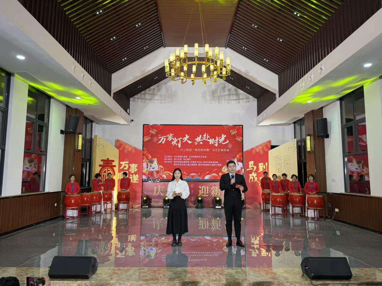 2025年12月29日晚,衢州市柯城区河边埂村文化礼堂内华灯璀璨、乐声飞扬,一场以“万家灯火,共赴时光”为主题的“村晚”文艺汇演在此精彩上演。这场由白云街道办事处、白云街道综合文化站主办,滨江社区、河边埂村承办,衢州学院机械学院、柯城区“8090+”新时代理论宣讲团、衢州市机关幼儿园兰园园区、衢州市实验幼儿园亭川园区协办的文化盛宴,不仅展现了基层文化的创新活力,更以“文化共建”为纽带,勾勒出城乡融合发展、代际情感联结的生动图景,为新时代基层治理注入温暖力量。