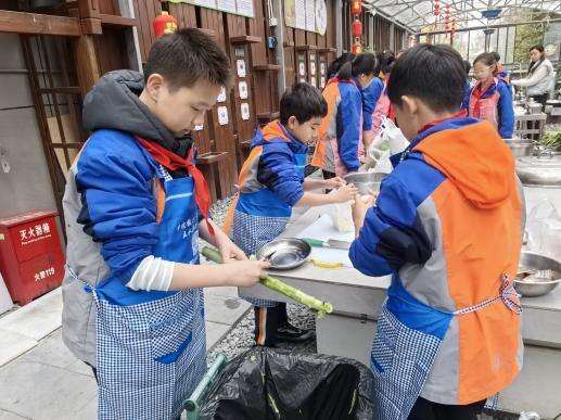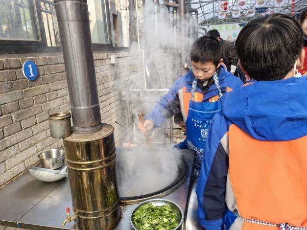 “这颗白菜真新鲜,炒年糕正好!”“这颗莴笋个头最壮,待会儿加进鱼头炖豆腐里!”六年级的“禾芽小厨”们穿梭在禾芽菜圃里,兴致勃勃队地拔大蒜、摘莴笋、抱白菜,沾着泥土的小手紧紧攥着自己的“战利品”,脸上的笑容比阳光还灿烂。这些带着晨露的蔬菜,转眼就被“搬”进了芽味厨房,成了“十二道芽味”课程的“明星食材”。