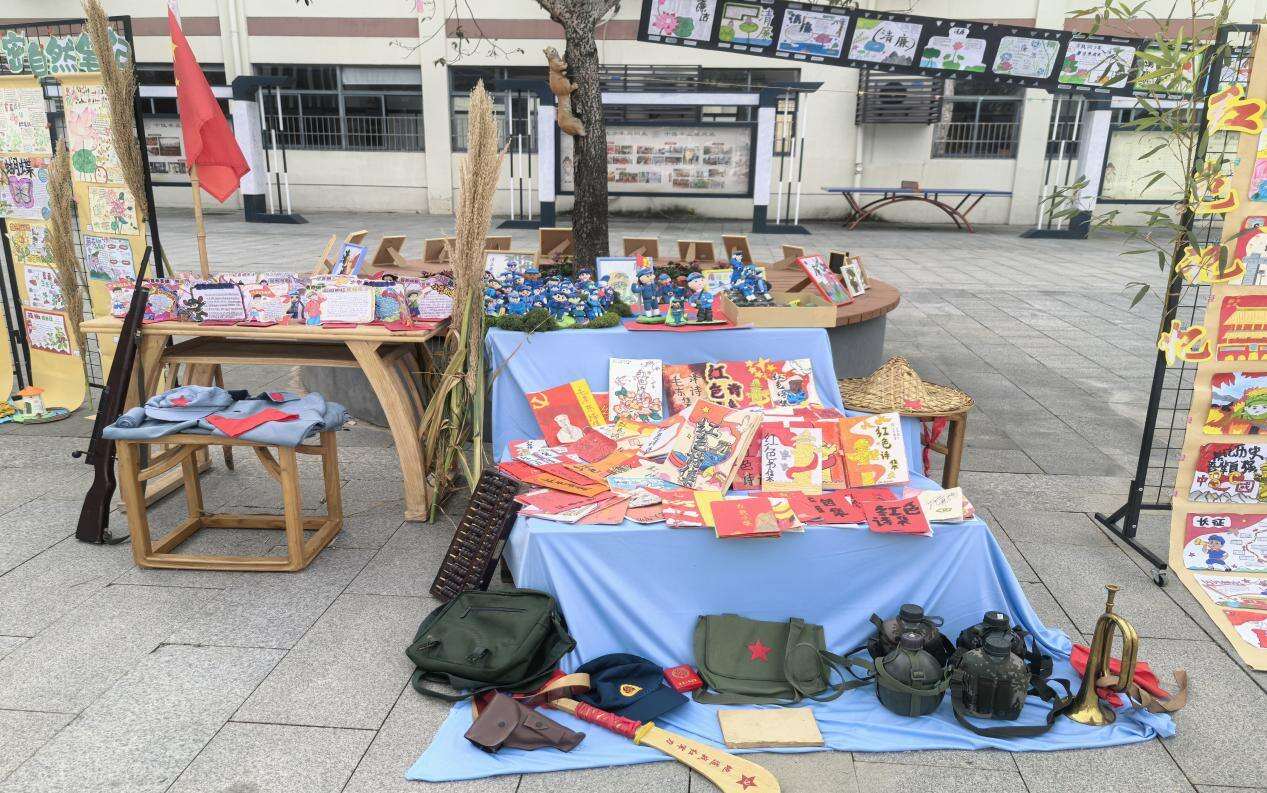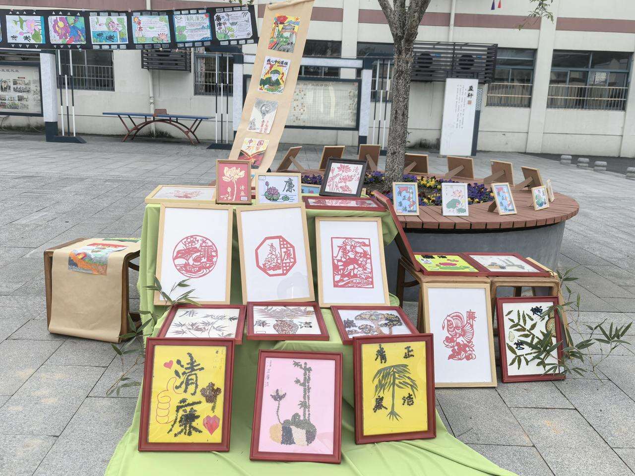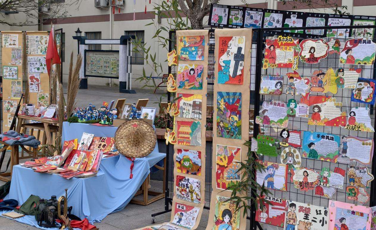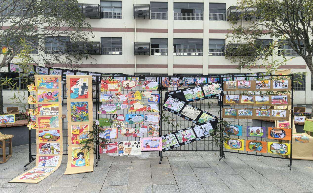 学子广场静态展区精心打造两大主题板块:其一为“清廉文化展”,以杨炯精神为引领,展出一年级匠心制作的清廉书签、二年级精心绘制的清廉手抄报、三年级创意无限的清廉五谷手贴画与剪纸、四年级妙笔生花的清廉画作、六年级自编自绘的清廉连环画,以及英语字母书、手抄报和读书笔记;其二为“红色记忆展”,陈列着孩子们亲手制作的红色人物卡、红色诗集,红军超轻黏土故事《红军过草地》《狼牙山五壮士》,还有悉心搜集的红色老物件。