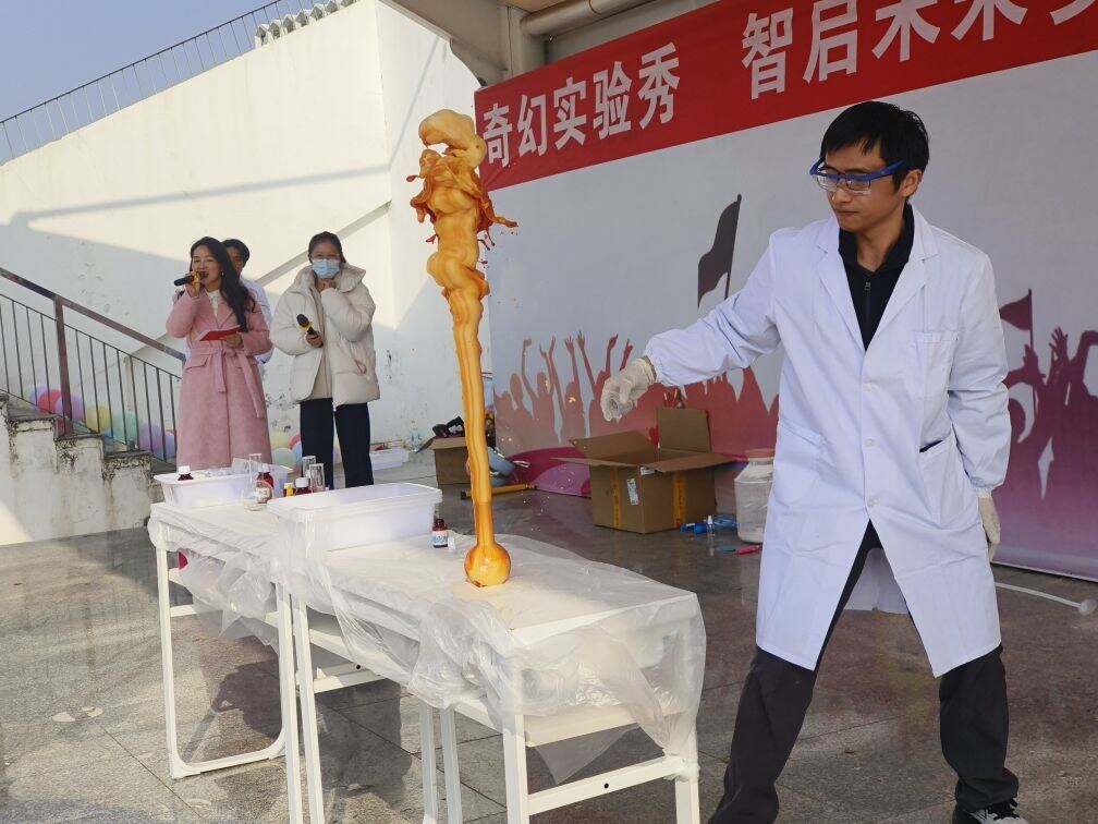 在主持人周超俏老师的引导下,科学组教师轮番登场,带来一场场颠覆认知的科学表演。郑凌星老师率先亮相,“大象牙膏”实验中,碘化钾催化双氧水瞬间产生的巨量泡沫,如白色火山般喷涌而出,数百倍的体积膨胀让全场发出惊叹;
