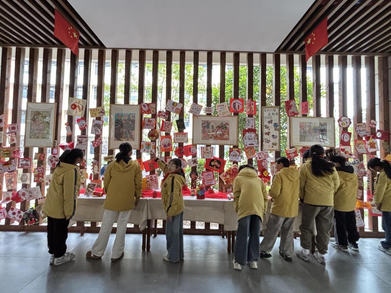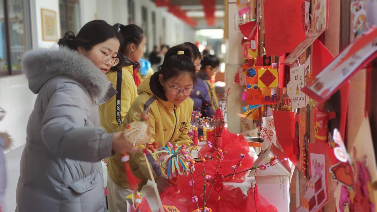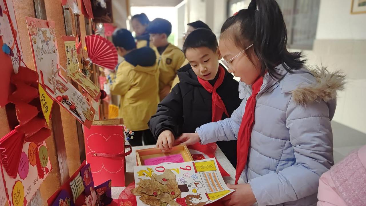 假期结束后,学校美术长廊摇身一变成为了充满创意与温情的“新年贺卡展”。百余件精心制作的作品整齐陈列,形态各异、风格鲜明:有的贺卡做成了立体的造型,打开就能看到藏在里面的新年祝福;有的以红色旧卡纸为基底,用碎布拼出可爱的生肖马图案,呼应新年主题;还有的搭配了各色树叶,让人感受到大自然的魅力。课间时分,同学们簇拥在展区周围,或驻足欣赏,或轻声交流。“你这个用旧报纸做的雪花太有创意了!”“我在贺卡里写了想对老师说的话,感谢她平时的照顾”……大家争相分享自己的创作思路,讲述作品背后的温情故事,言语间满是对新年的憧憬与期待。