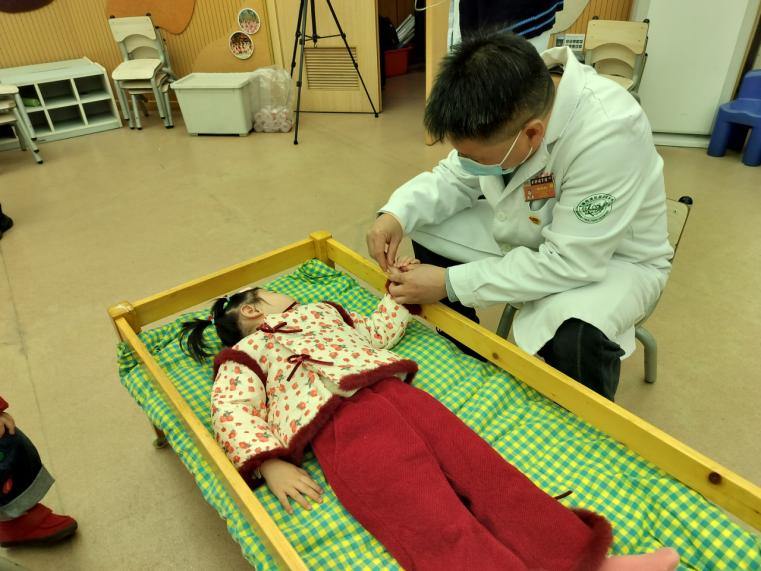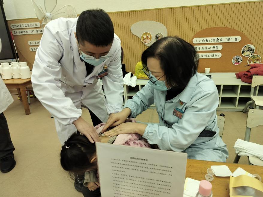 活动现场,医护人员化身“健康守护者”与“国医文化传播官”,带来了一系列定制化暖心服务。在小儿推拿专区,医护人员凭借娴熟轻柔的手法,为孩子们进行专业小儿推拿,健脾胃、促消化、护生长,守护稚嫩体魄;一旁的流感贴体验区,医护人员耐心地向老师和孩子们讲解贴敷原理与注意事项,并为有兴趣的老师和孩子进行现场体验。