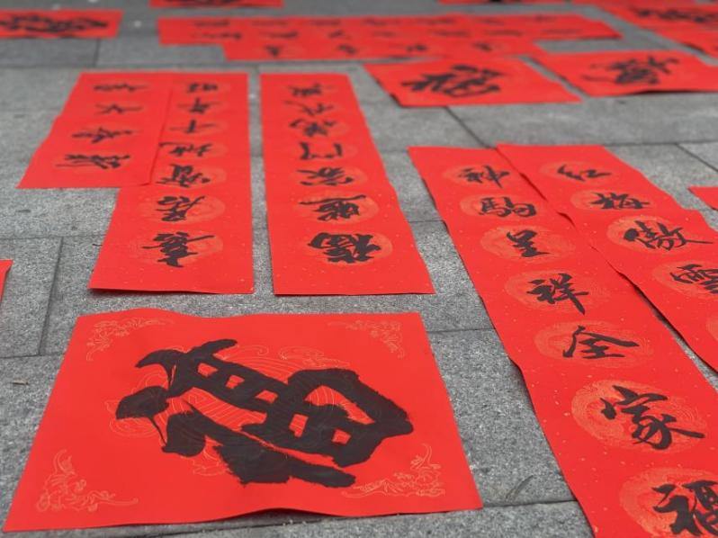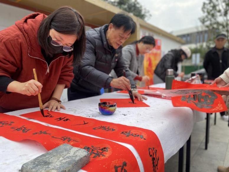 “马到成功”“马上有钱”……活动现场,红纸铺展,翰墨飘香。书法老师们凝神运笔,将吉祥寓意融于字里行间,亦创作出许多融合时代气息的新颖联句。困难群众、残疾人、退役军人等社区居民围聚案前,挑选心仪的联语,等待墨迹风干,笑语与墨香交织成生动的迎春图景。